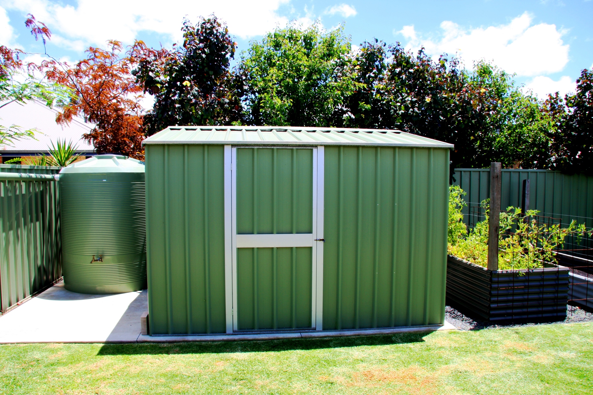 3x3m shed and 2500L rainwater tank on solid concrete slab.