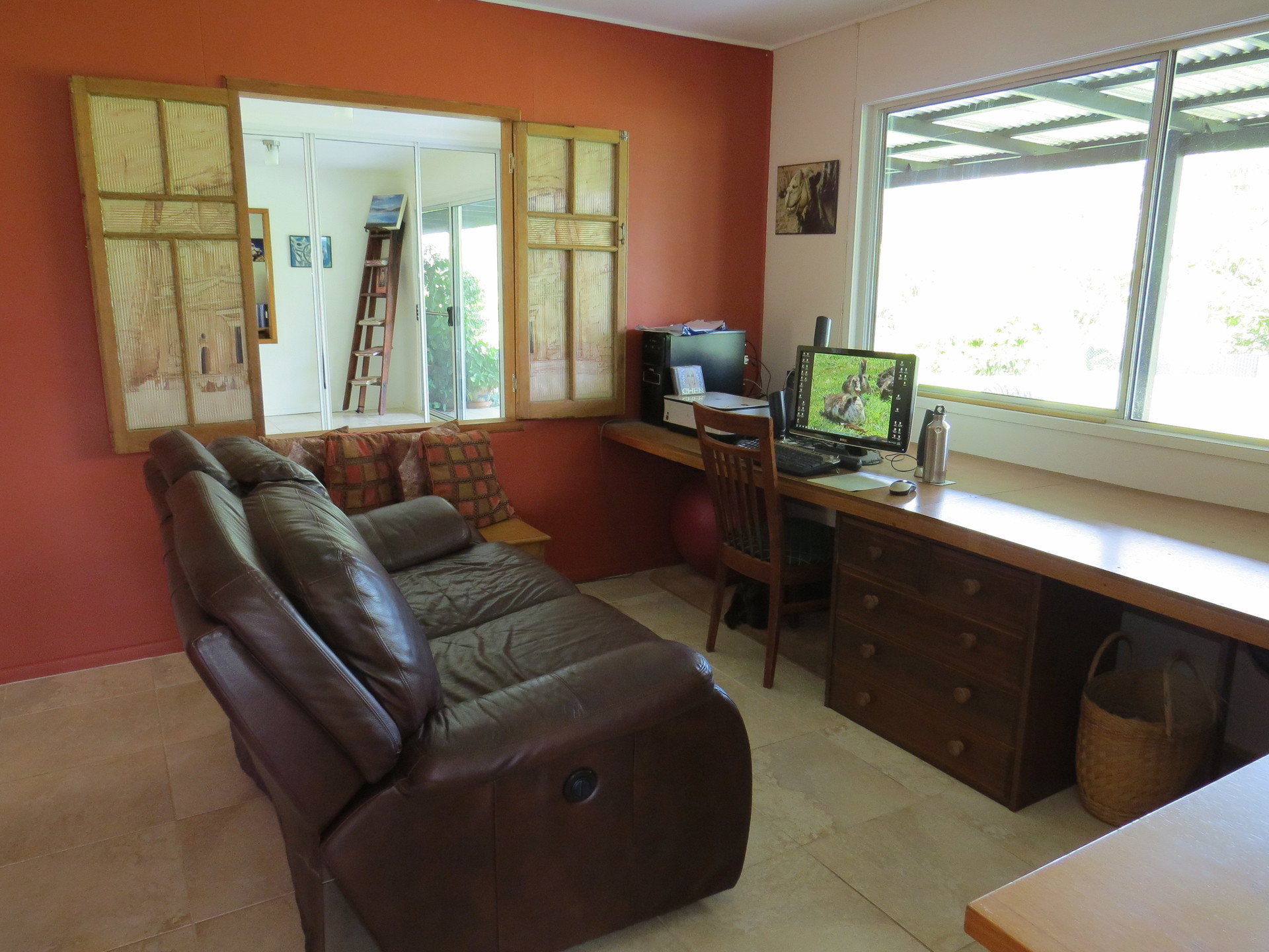 The study has enjoyable views to the lush outdoors (as does every other room in the home). The second bedroom is a double room with sofa and coffee table as well as a large built in solid wood study desk. Looking out from here, across both dams, as the geese, ducks, goats and kangaroos graze is nothing short of idyllic. Idyllic is just the norm here at the ‘Garden of Eatin’.