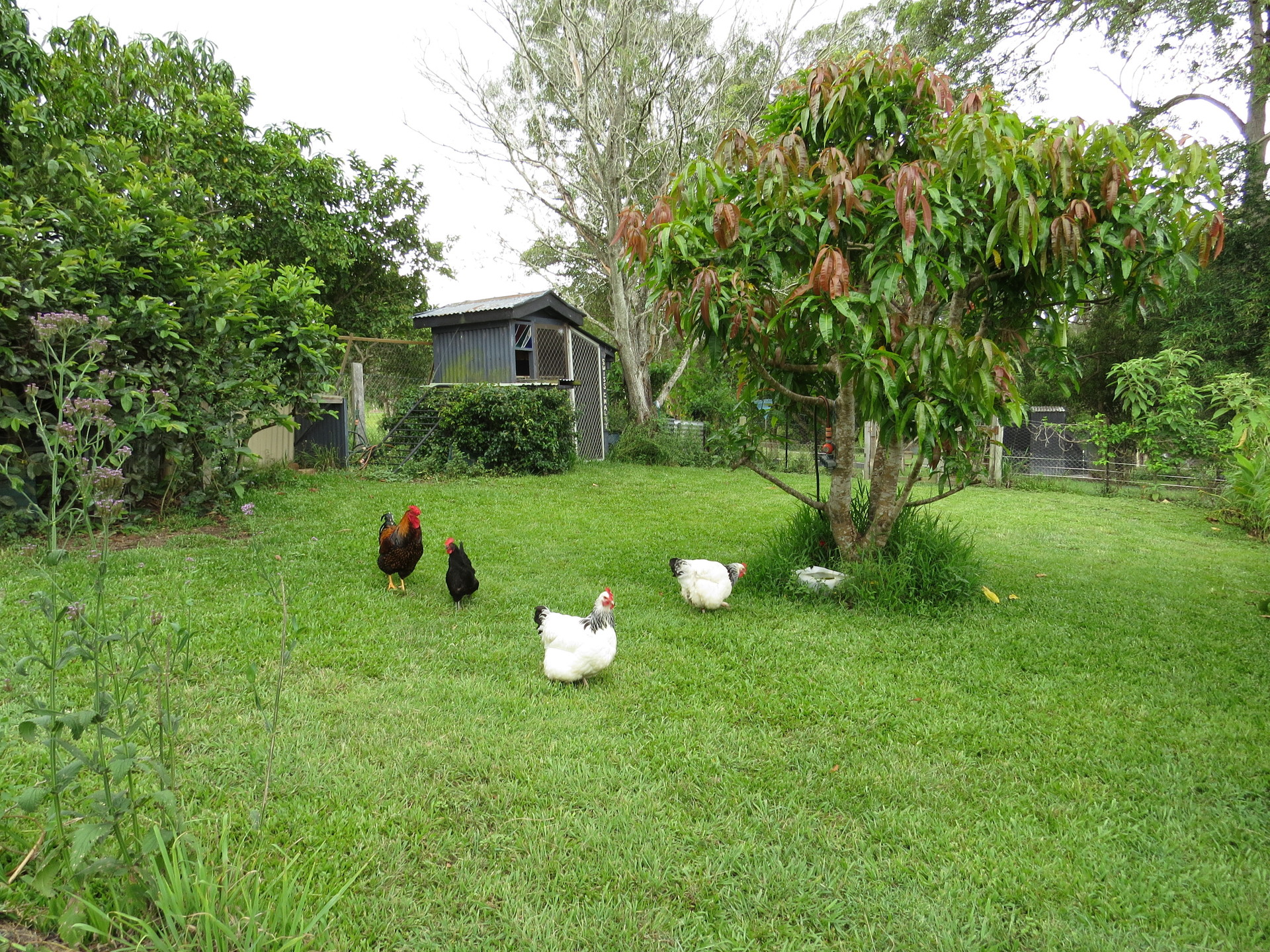 The heritage chooks enjoy a large grassed double chook run, and the safe and spacious ‘Swiss Chalet’ by night.