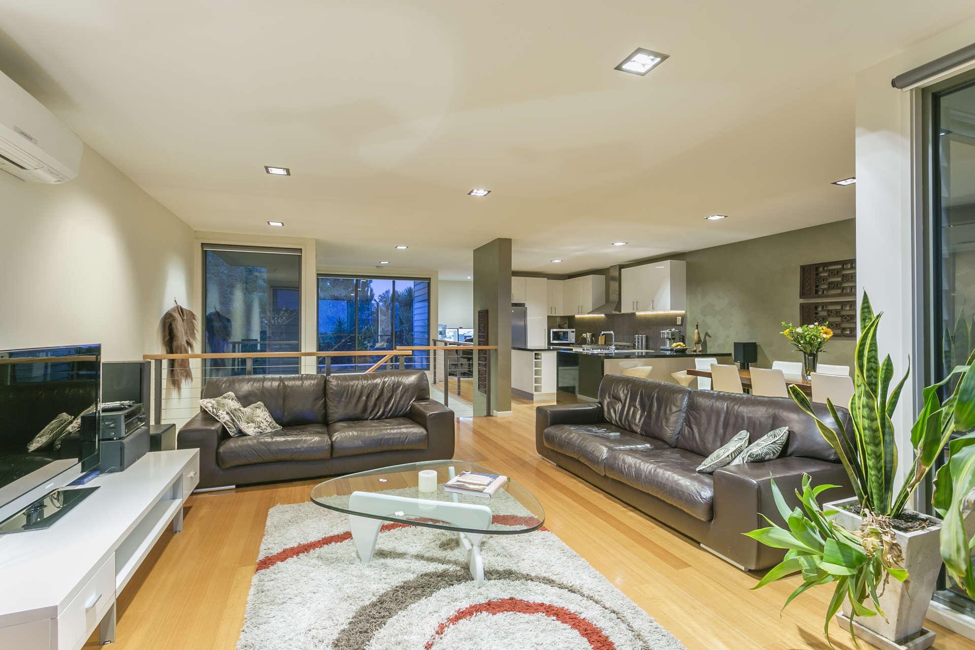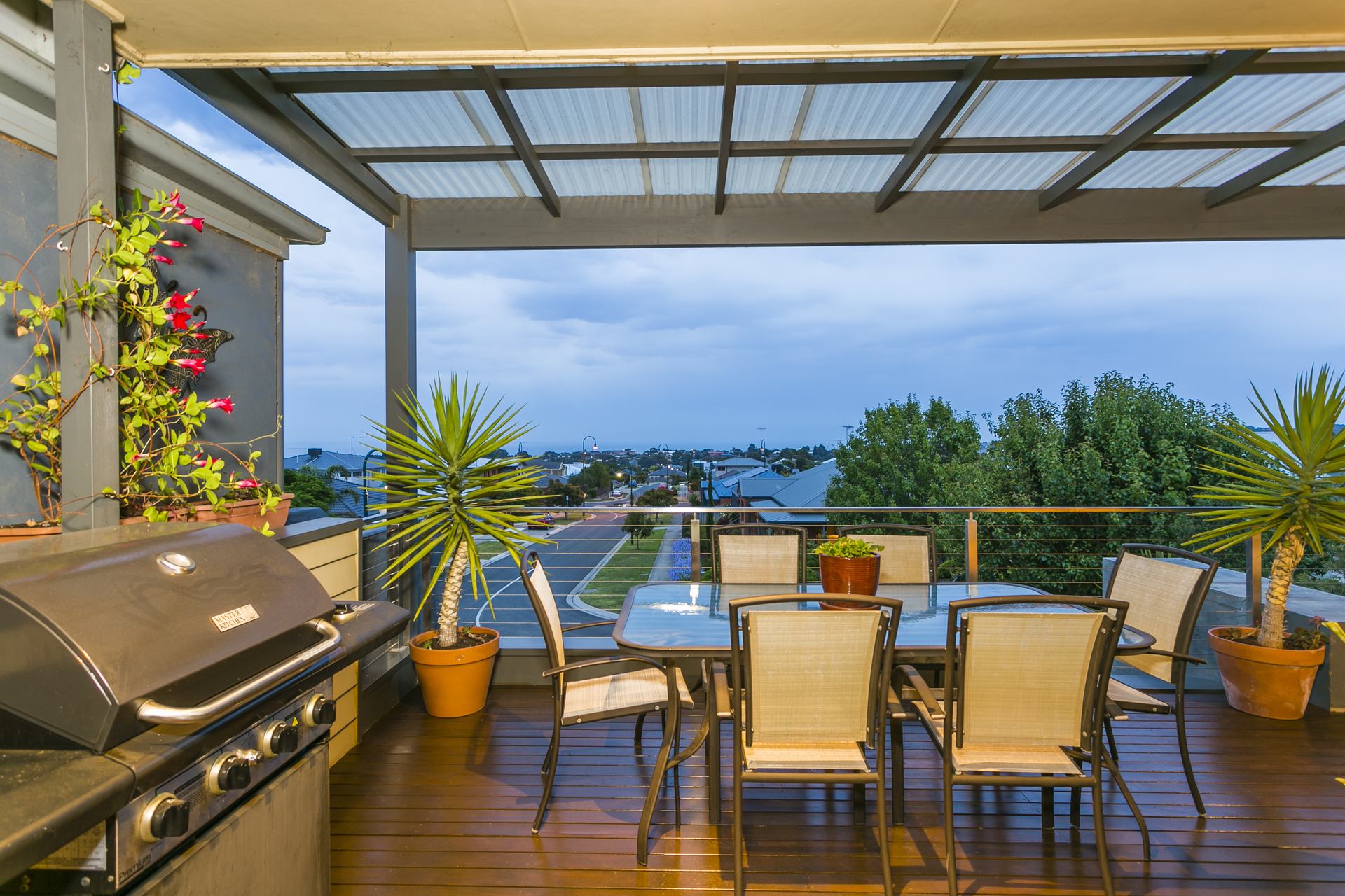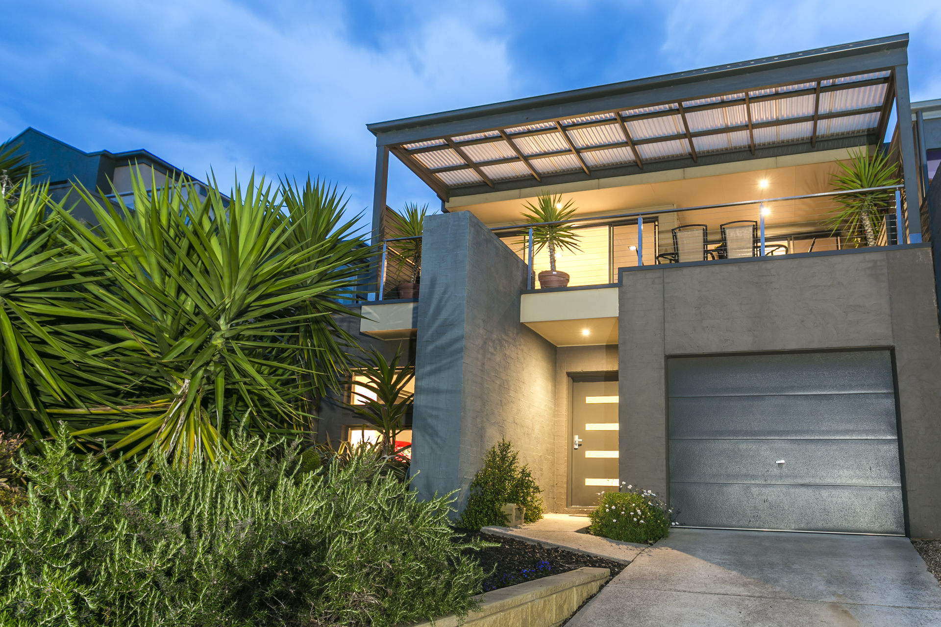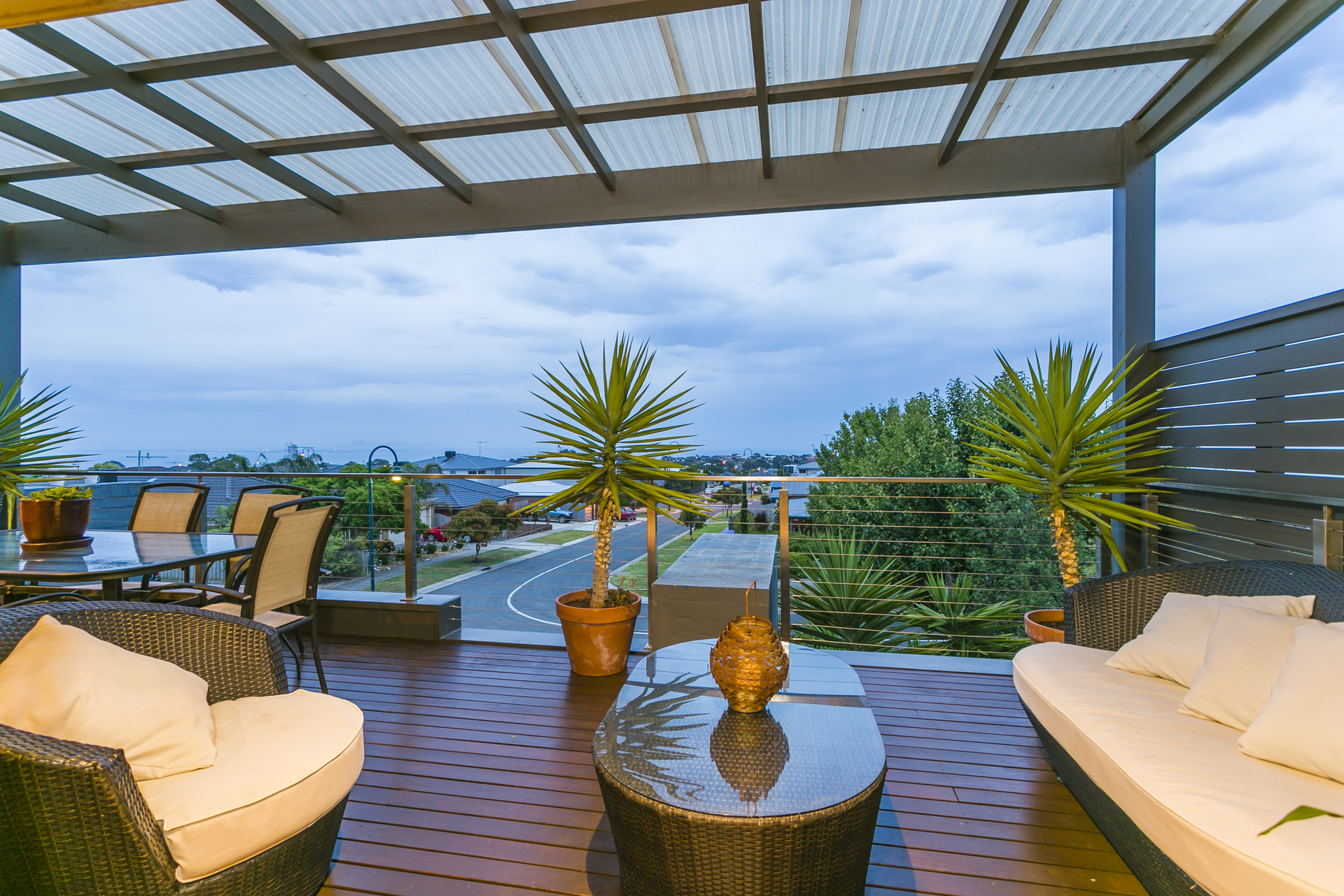 This architecturally designed double storey home comprises of 3 generous bedrooms on the ground level, all with built in robes and the Master has a large walk in robe. There is also a spacious ensuite with double shower, split system heating and cooling and beautiful garden views. Central to the house is floor to ceiling glass allowing natural light to flood the space and bounce off the polished concrete floors. Leading you upstairs to the living area is an open solid timber stair case which wraps around to a mezzanine level giving you an enormous sense of space and openness. The kitchen is an entertainer’s delight with an island and huge benches to prepare meals. Appliances include a 900mm stand-alone oven and gas cook-top, stunning canopy range hood and dishwasher. The living area has a split system and also a gas log fire for cosy nights in winter. A study nook is conveniently located by the kitchen area and there is also a powder room to service upstairs. The north facing roofed deck area has an abundance of room to entertain large groups of friends and family. The views are simply breathtaking overlooking Geelong, the You Yangs, Avalon and 180 degrees of the Bay. An established tropical garden is low maintenance and includes fruit trees and ample space for herbs and seasonal vegetables.
