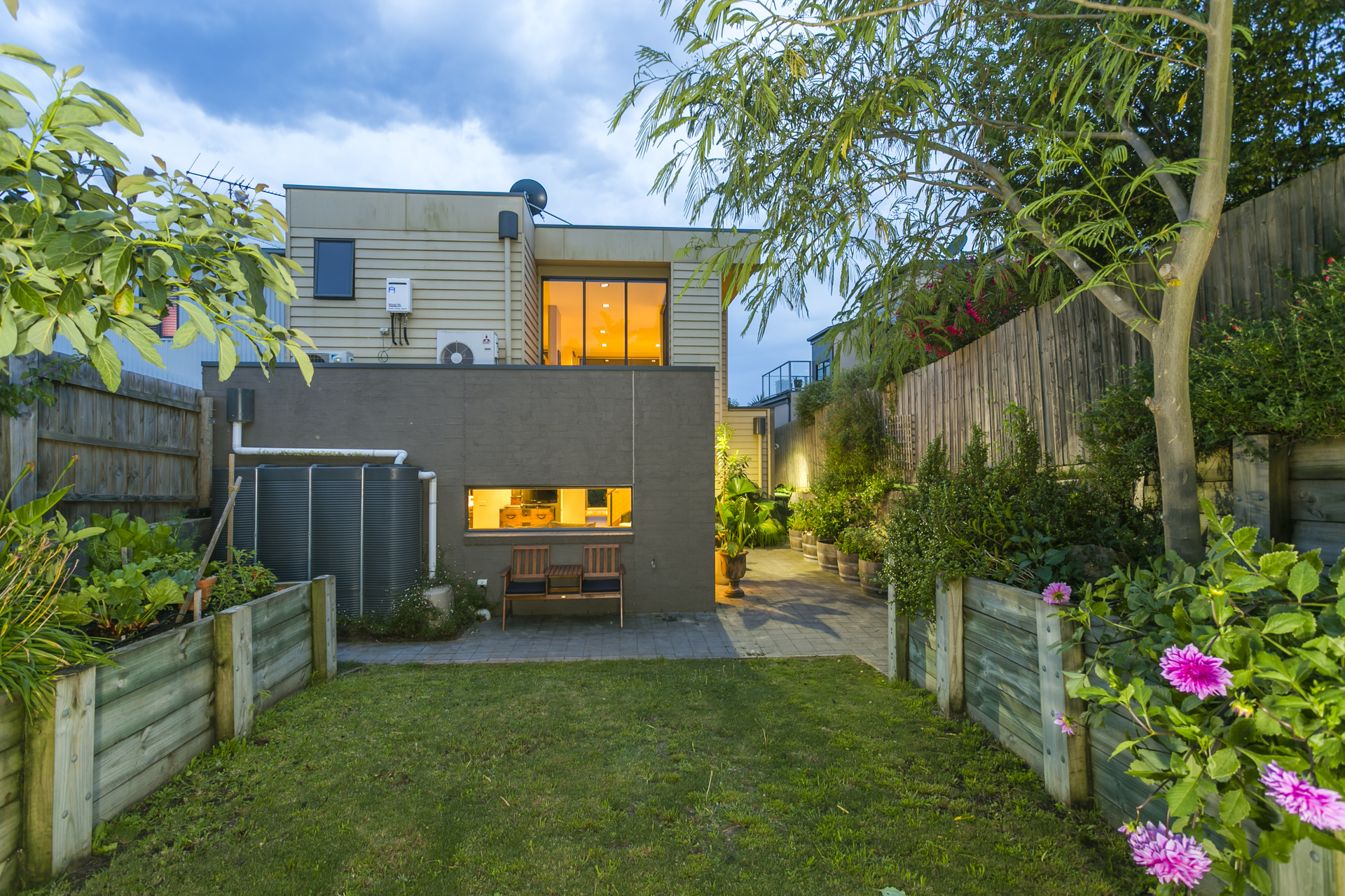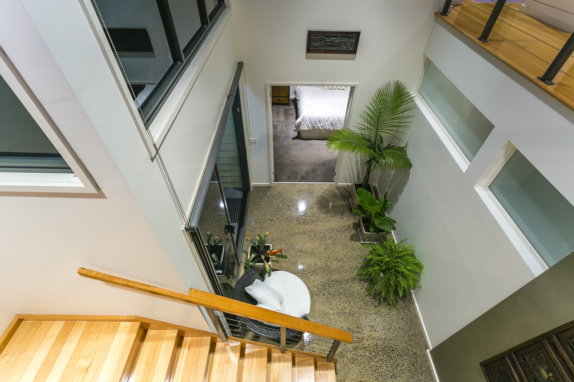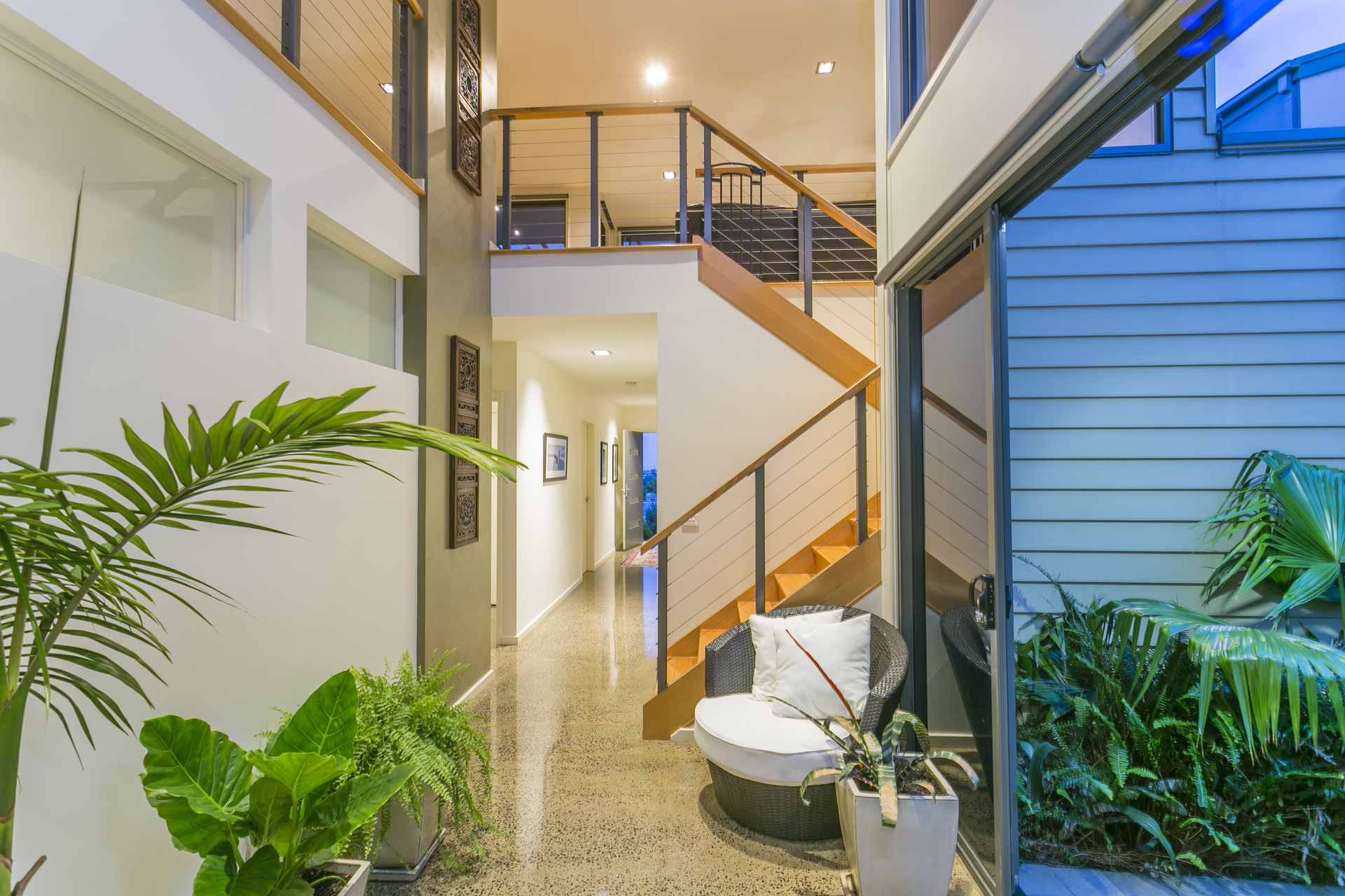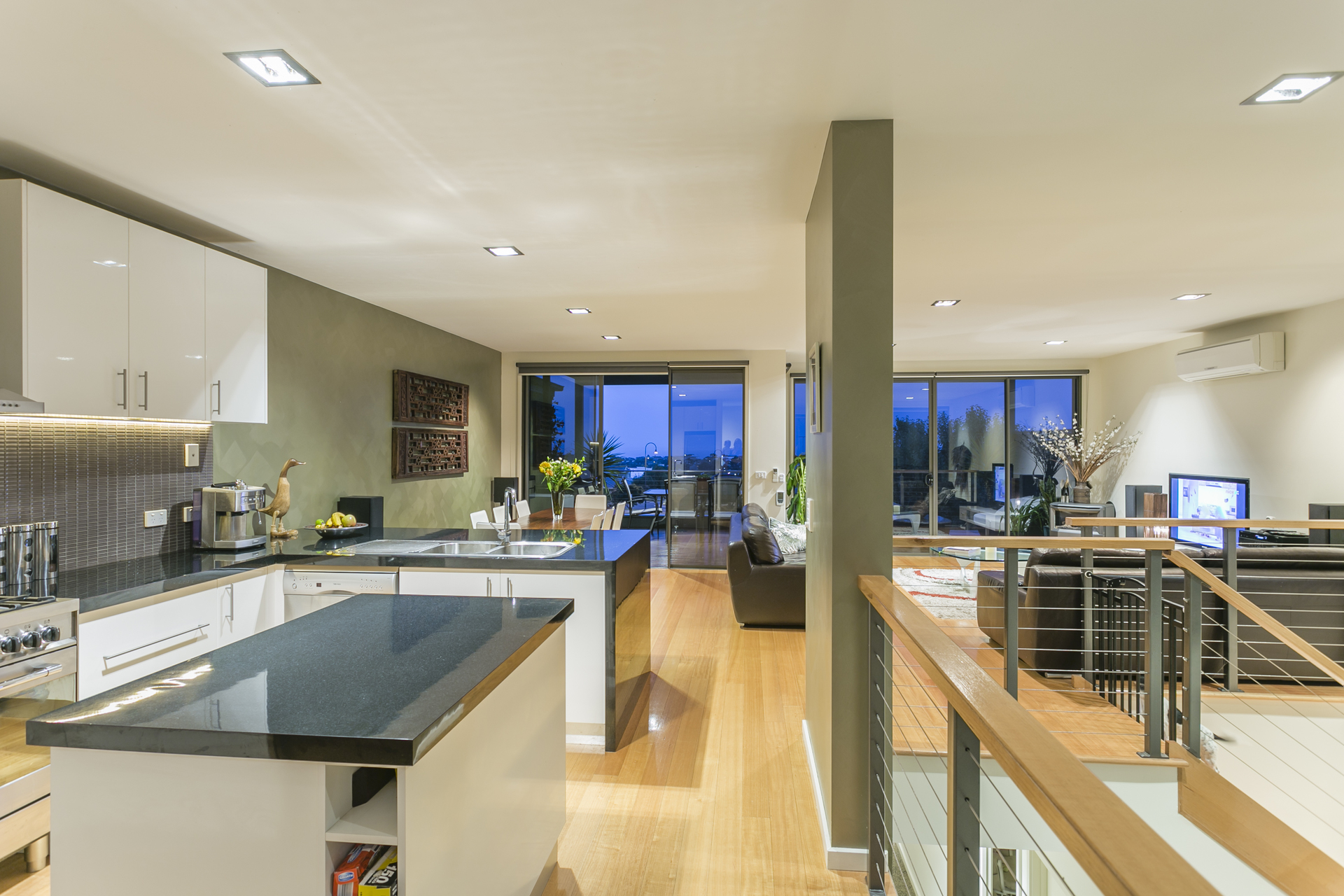 This architecturally designed double storey home comprises of 3 generous bedrooms on the ground level, all with built in robes and the Master has a large walk in robe. There is also a spacious ensuite with double shower, split system heating and cooling and beautiful garden views. Central to the house is floor to ceiling glass allowing natural light to flood the space and bounce off the polished concrete floors. Leading you upstairs to the living area is an open solid timber stair case which wraps around to a mezzanine level giving you an enormous sense of space and openness. The kitchen is an entertainer’s delight with an island and huge benches to prepare meals. Appliances include a 900mm stand-alone oven and gas cook-top, stunning canopy range hood and dishwasher. The living area has a split system and also a gas log fire for cosy nights in winter. A study nook is conveniently located by the kitchen area and there is also a powder room to service upstairs. The north facing roofed deck area has an abundance of room to entertain large groups of friends and family. The views are simply breathtaking overlooking Geelong, the You Yangs, Avalon and 180 degrees of the Bay. An established tropical garden is low maintenance and includes fruit trees and ample space for herbs and seasonal vegetables.