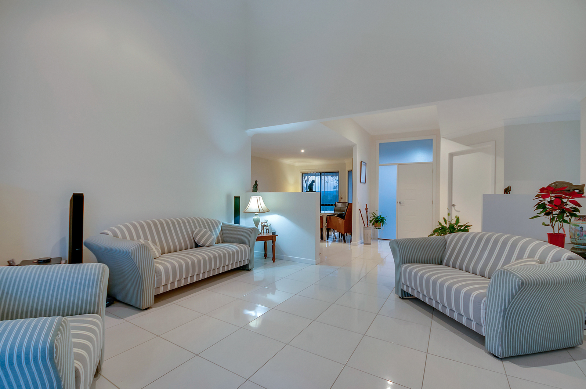 The grand entrance foyer leads into the very spacious lounge with its high mono pitch ceiling with a glass outlook to the back patio (wired for sound and gas outlets for BBqQ) and half acre of yard.