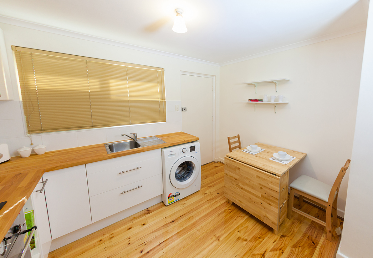 - A brand new chef's-delight kitchen featuring solid timber bench tops and European appliances. Lots of details have been put into the design of the kitchen including a corner base cabinet carousel & an integrated laundry.