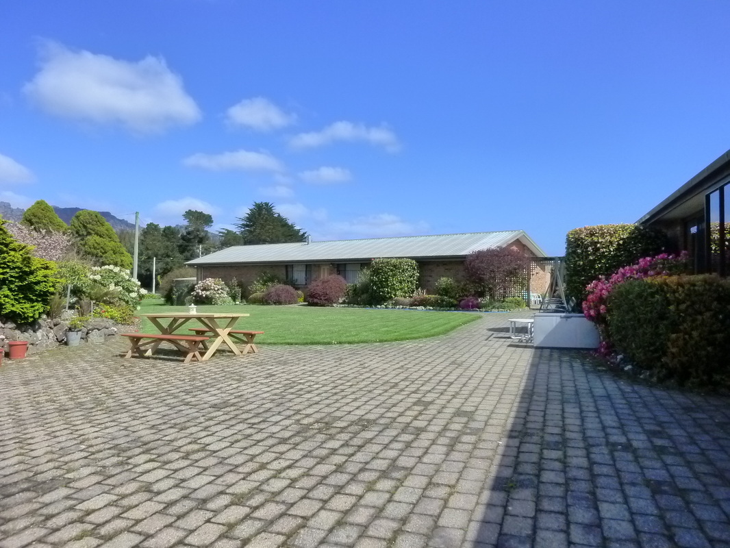 The main house is a lowset brick residence which has previously been used as a Bed and Breakfast. It consists of four bedrooms, 3 with ensuites and the fourth with a private bathroom. The main bedroom is large enough for a sitting area and has a large ensuite containing a spa with views toward Cradle Mountain. There is a kitchen with a family/dining area, and a separate lounge and dining room, as well as a study. A separate building contains two double garages and a studio apartment-- ideal as a granny flat or teen retreat.