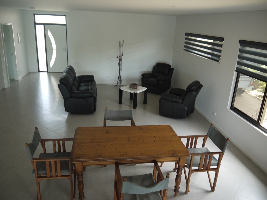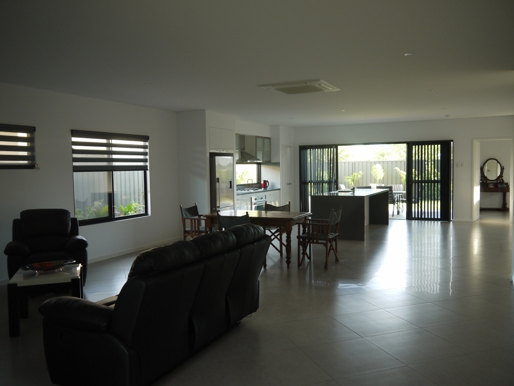 OPEN PLAN LIVING- Open the front door and you won't believe the living space! Leading through lounge, dining area and kitchen straight to delightful back patio edged with lawns and gardens. White interior walls, black window trims and charcoal blinds with grey tiles make it easy to furnish your new home.