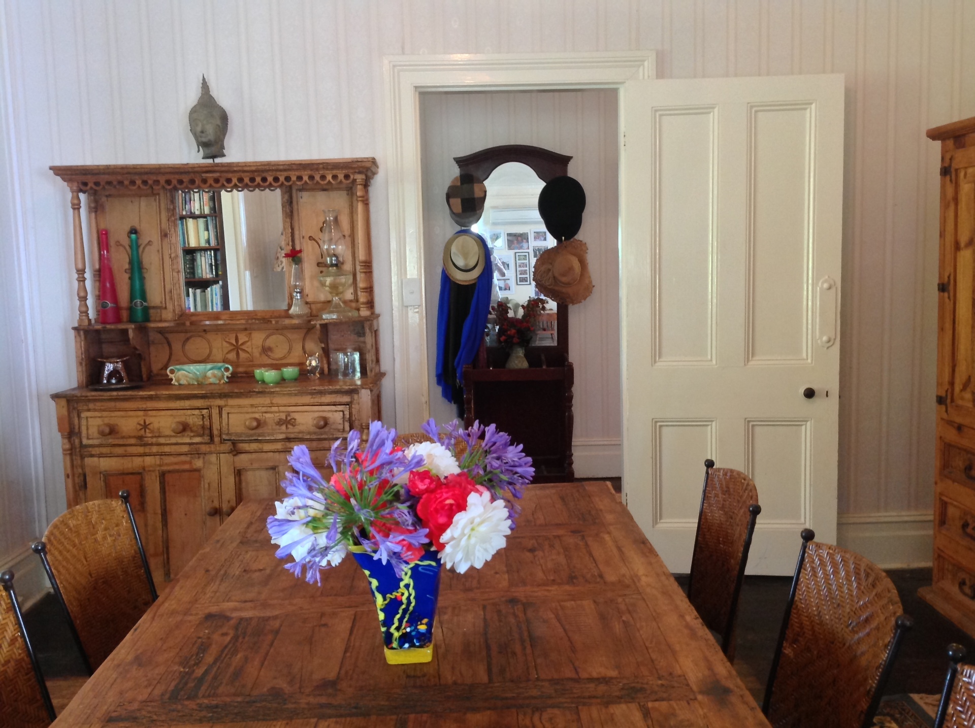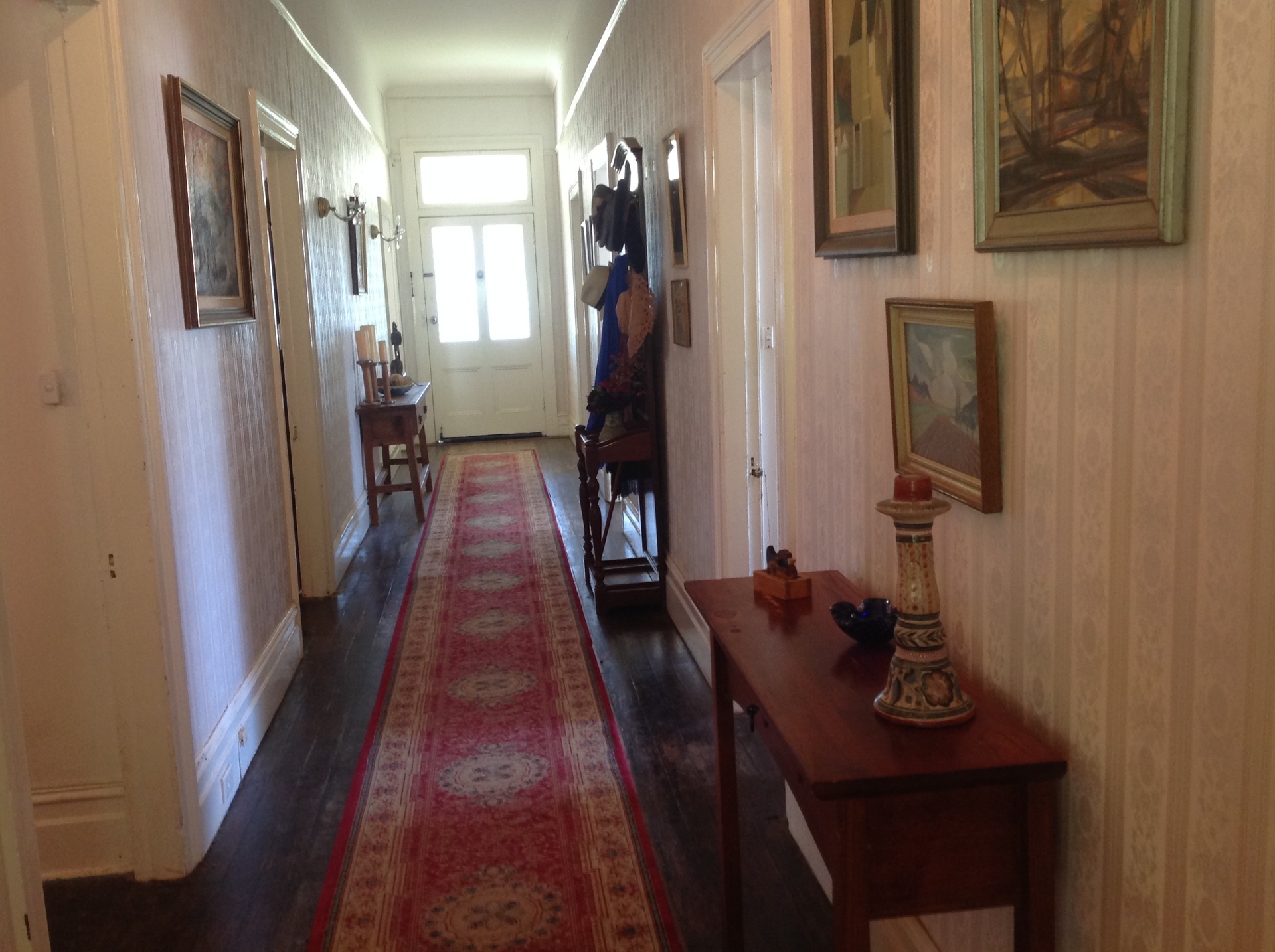 A beautiful 14 meter hallway with polished floor boards leading to gracious lounge and dining room with open fire places.
