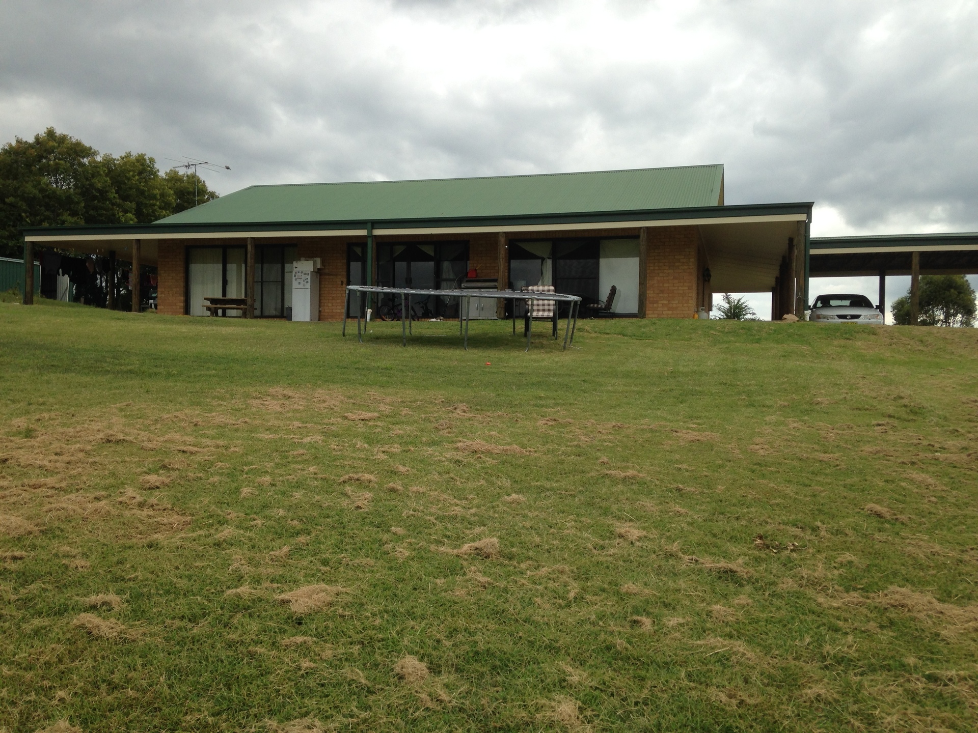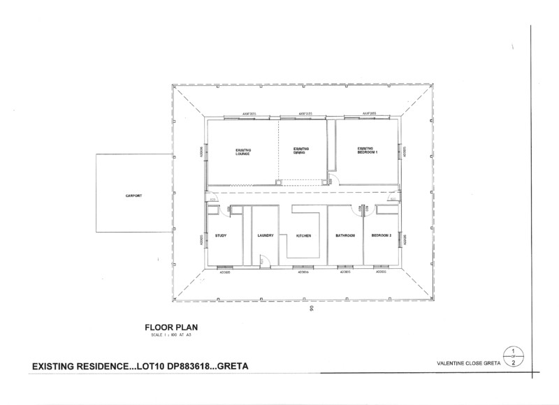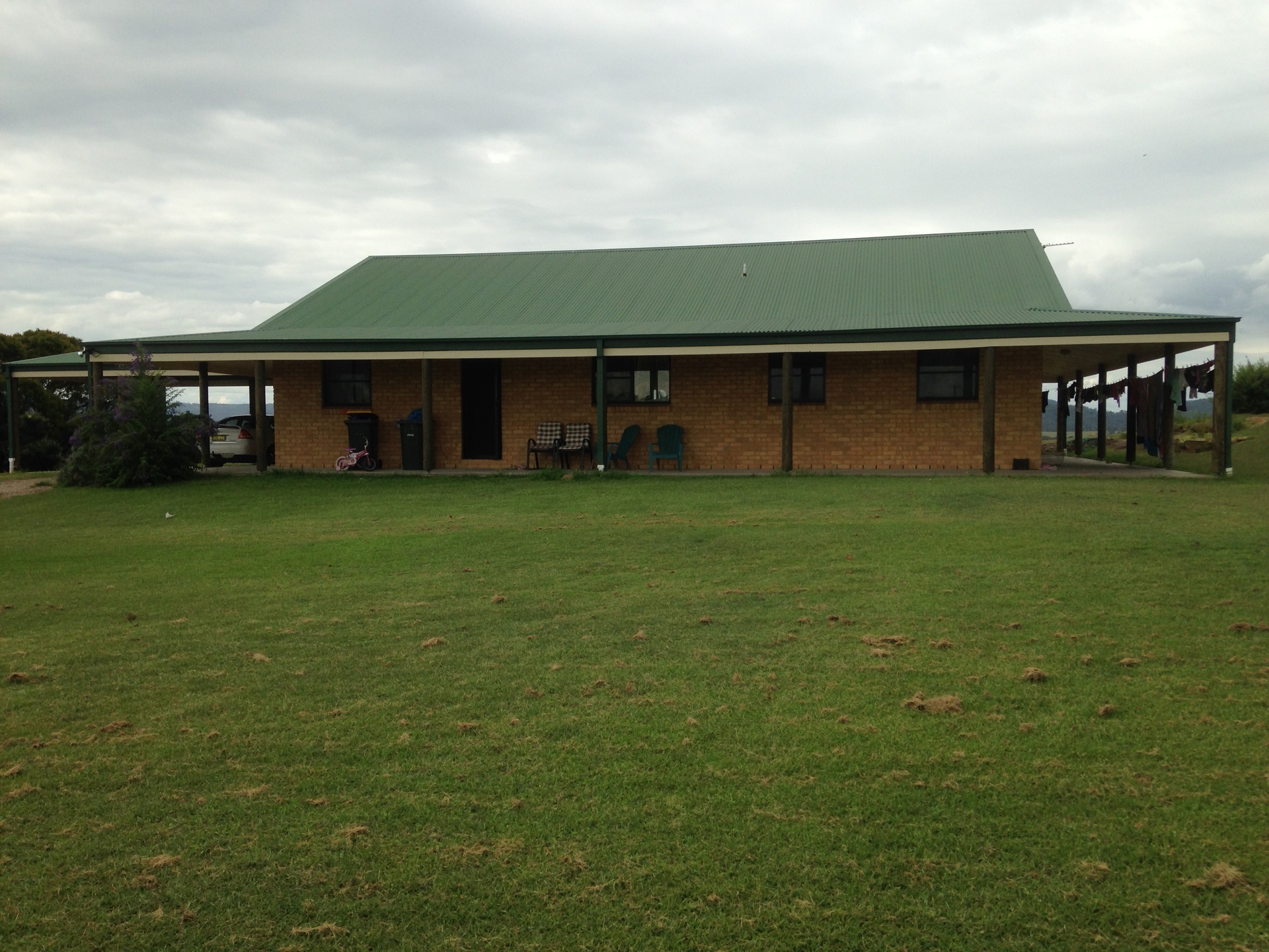 The house has 179 s.m. of living area including three bedrooms, one bathroom & a large laundry. The open plan living/eating/cooking area of 68 s.m. has timber-lined ceilings. There are 2.4 m (8 feet) wide verandahs on all sides - a total of 152 s.m. and a double carport of approx 40 s.m. All up there is about 367 s.m. (39 squares) under roof. Construction is brick veneer on a concrete slab with aluminium windows and a Colorbond roof.