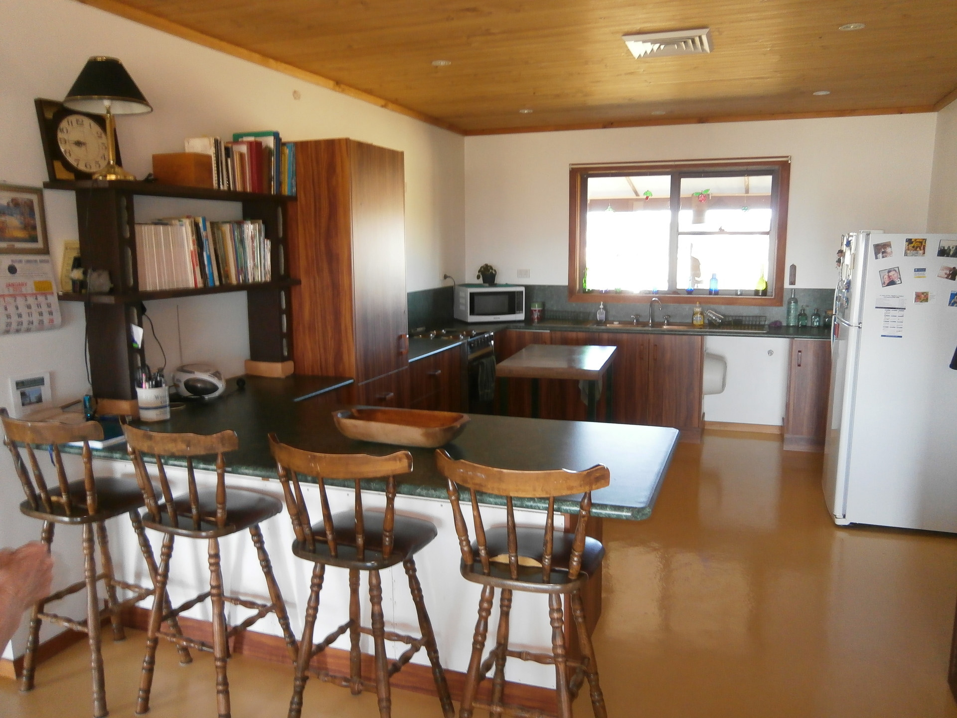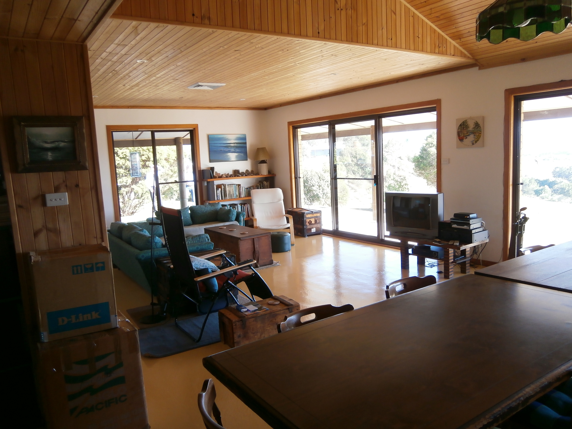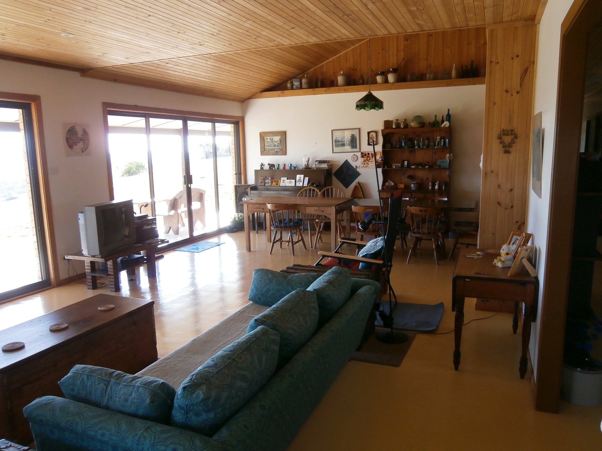 The house has 179 s.m. of living area including three bedrooms, one bathroom & a large laundry. The open plan living/eating/cooking area of 68 s.m. has timber-lined ceilings. There are 2.4 m (8 feet) wide verandahs on all sides - a total of 152 s.m. and a double carport of approx 40 s.m. All up there is about 367 s.m. (39 squares) under roof. Construction is brick veneer on a concrete slab with aluminium windows and a Colorbond roof.