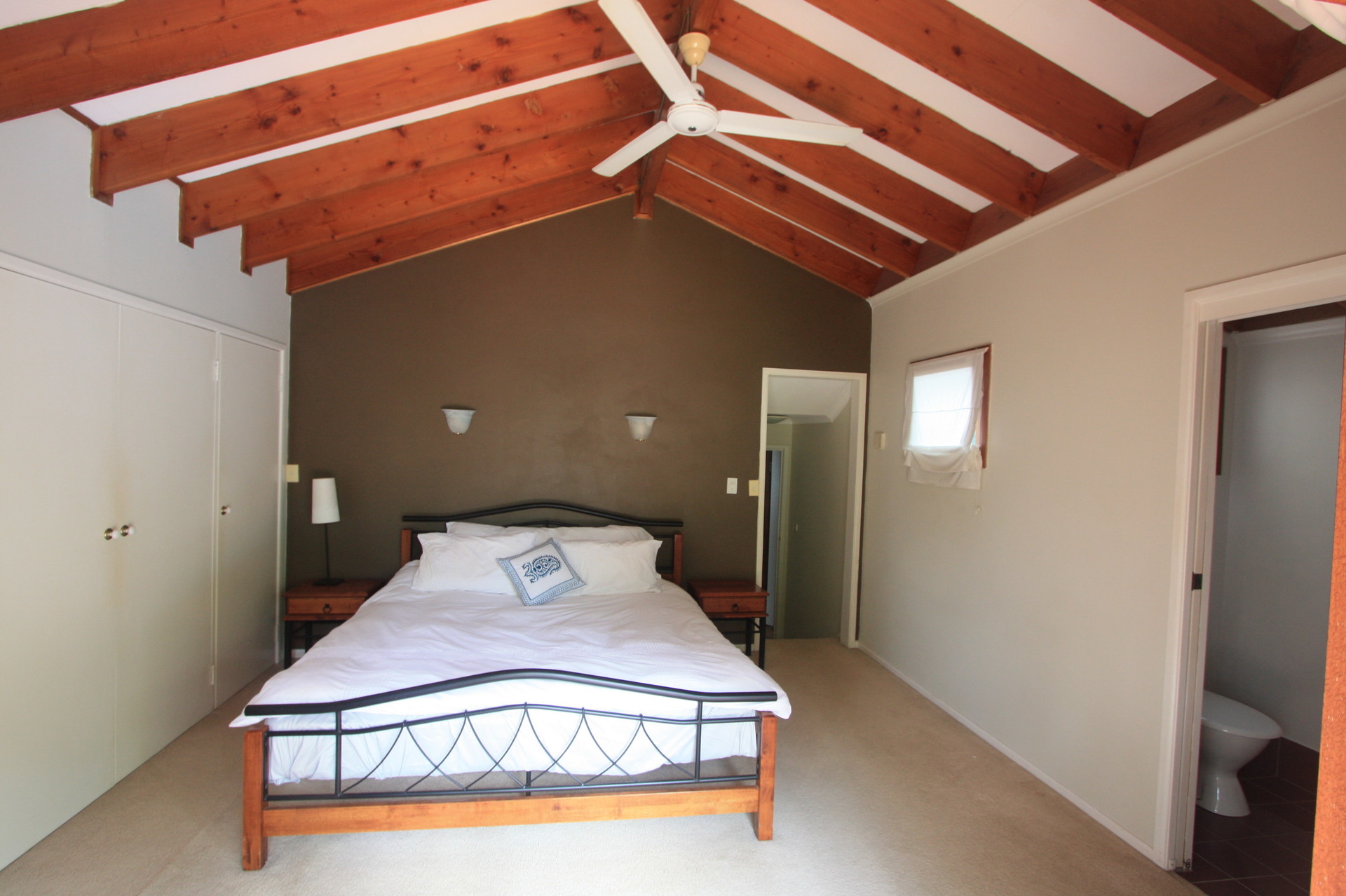 The master bedroom has high ceilings with exposed timber beams and double french doors, which open onto the deck and overlook the backyard and pool. The master bedroom is also complemented by built in wardrobes and en-suite toilet/powder room.