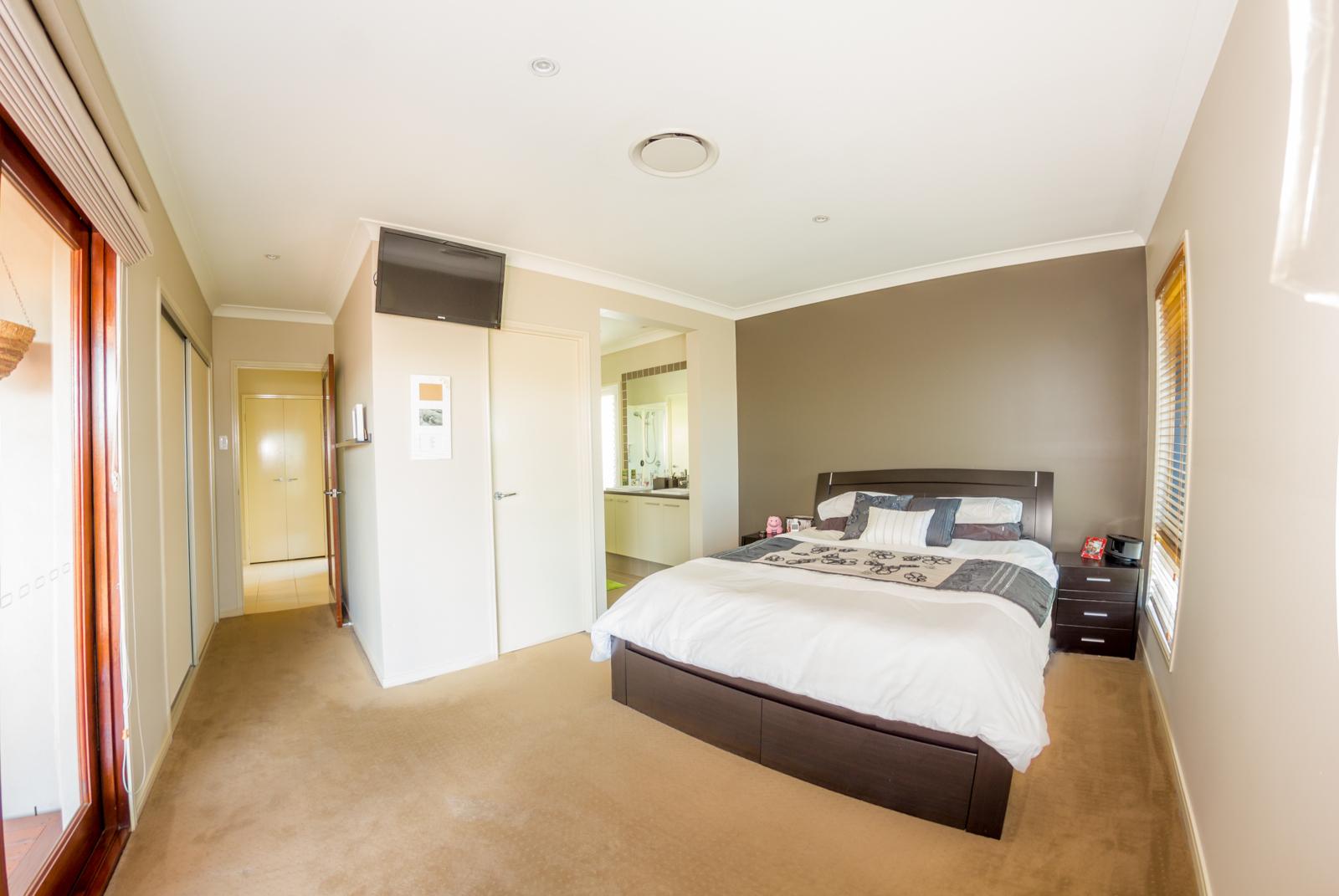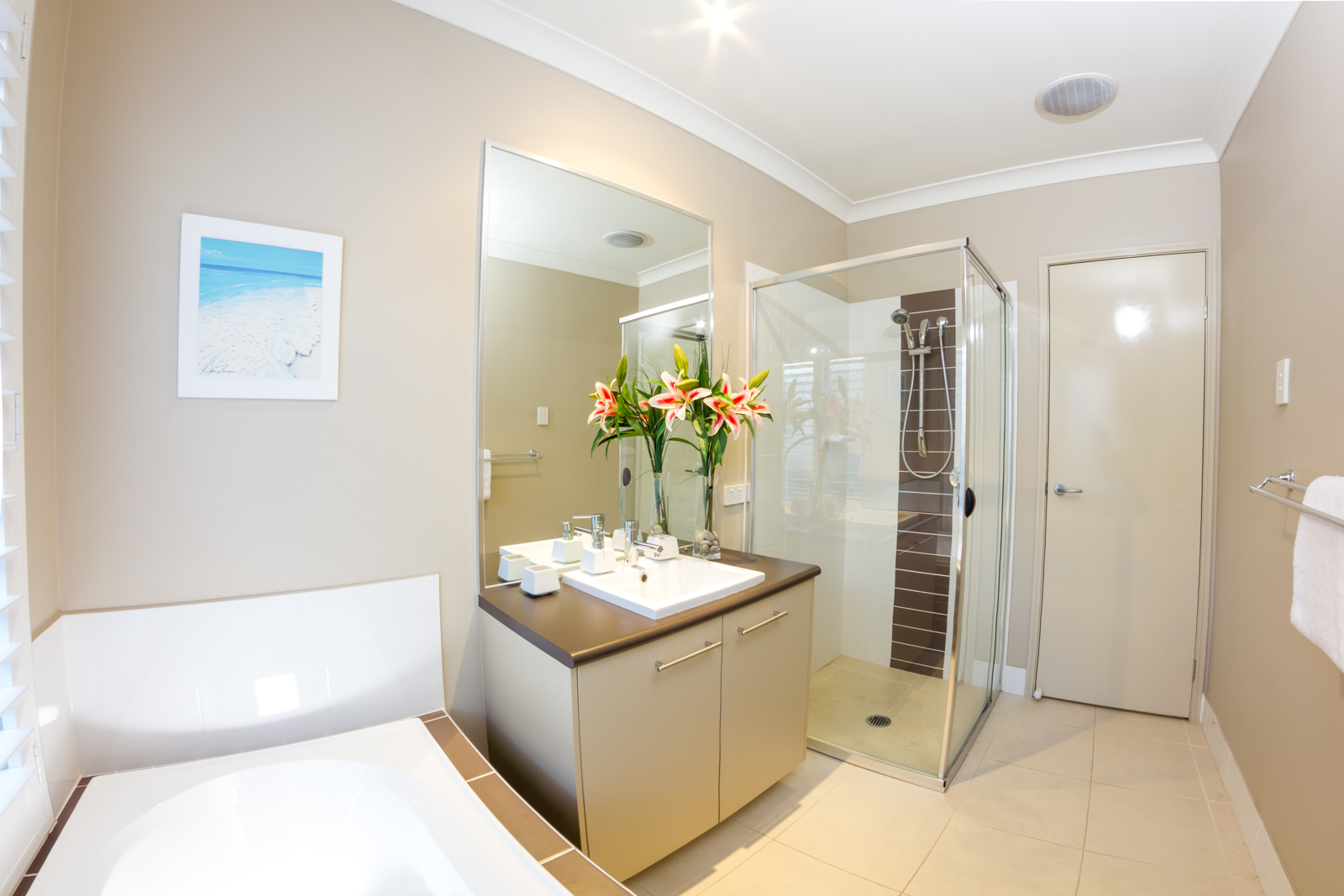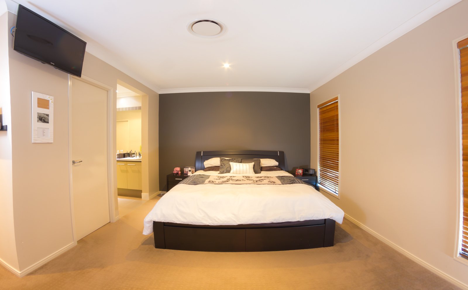 The resort style master bedroom suite features massive cupboard space and walk-in-robe, Double shower heads, his/hers sinks and bi-folding doors opening out onto the alfresco area. Beautiful for brining the outdoors in.