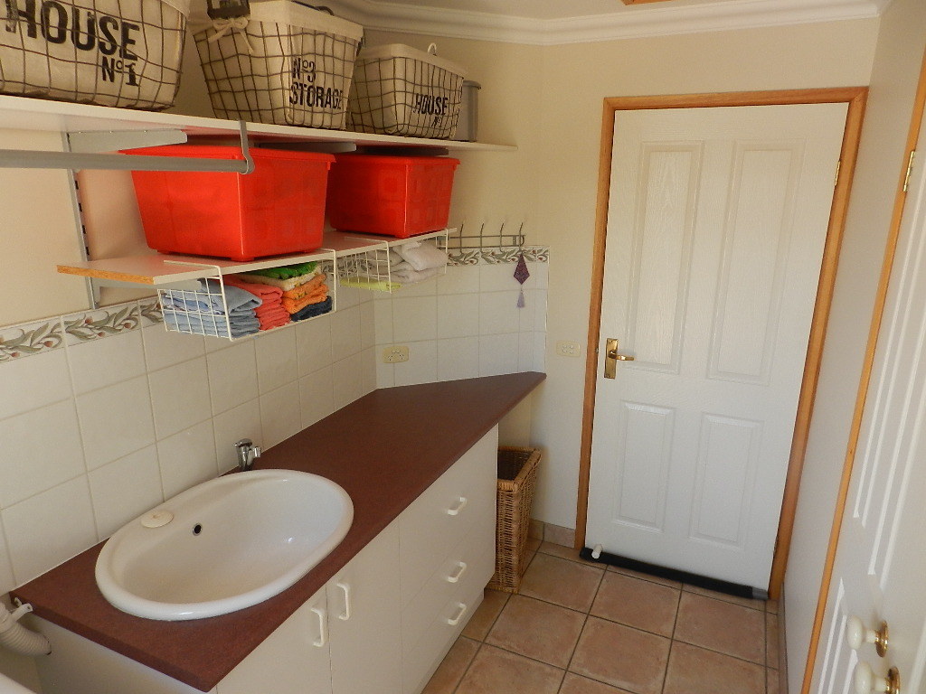 The gallery style laundry has been finished with a deep, porcelain sink, adjustable shelving, double door linen press, utilities cupboard and plenty of bench space. The laundry opens directly out to a beautifully landscaped private court yard with paved clothes line area capturing ample sunlight all year round.