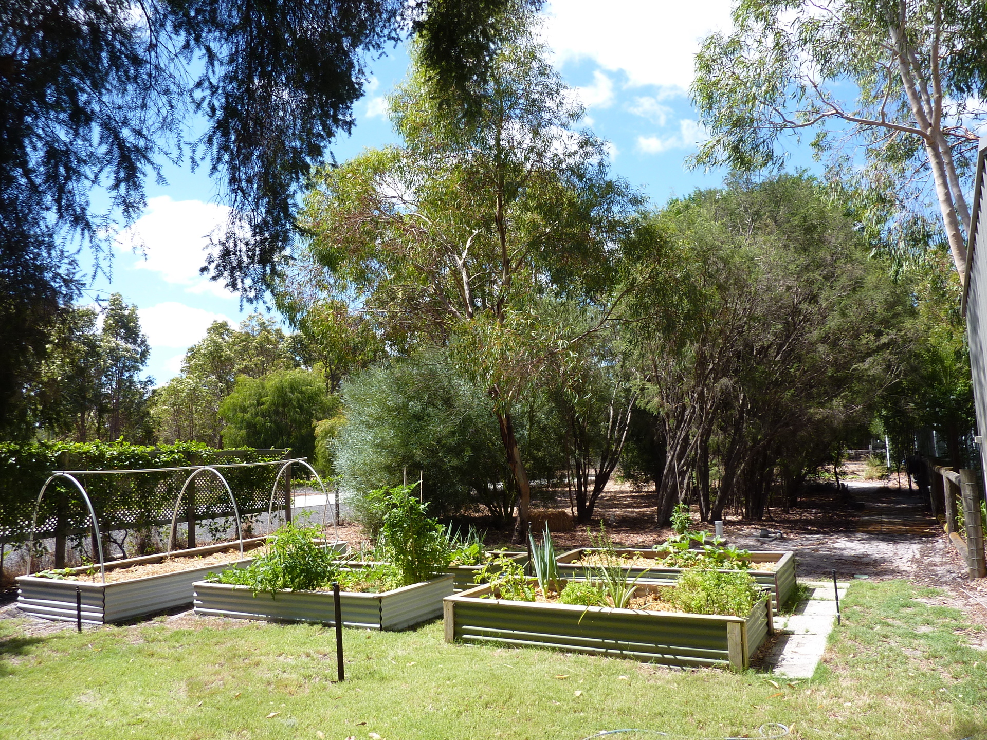 There is a large vegetable garden with multiple raised garden beds. A large impressive chook yard, hen house and a big bird cage/aviary. The gardens are fully reticulated from the bore.