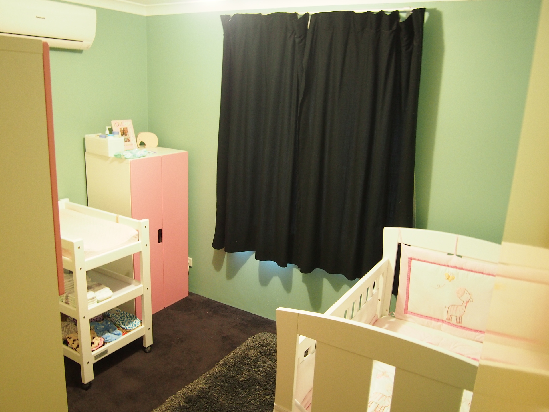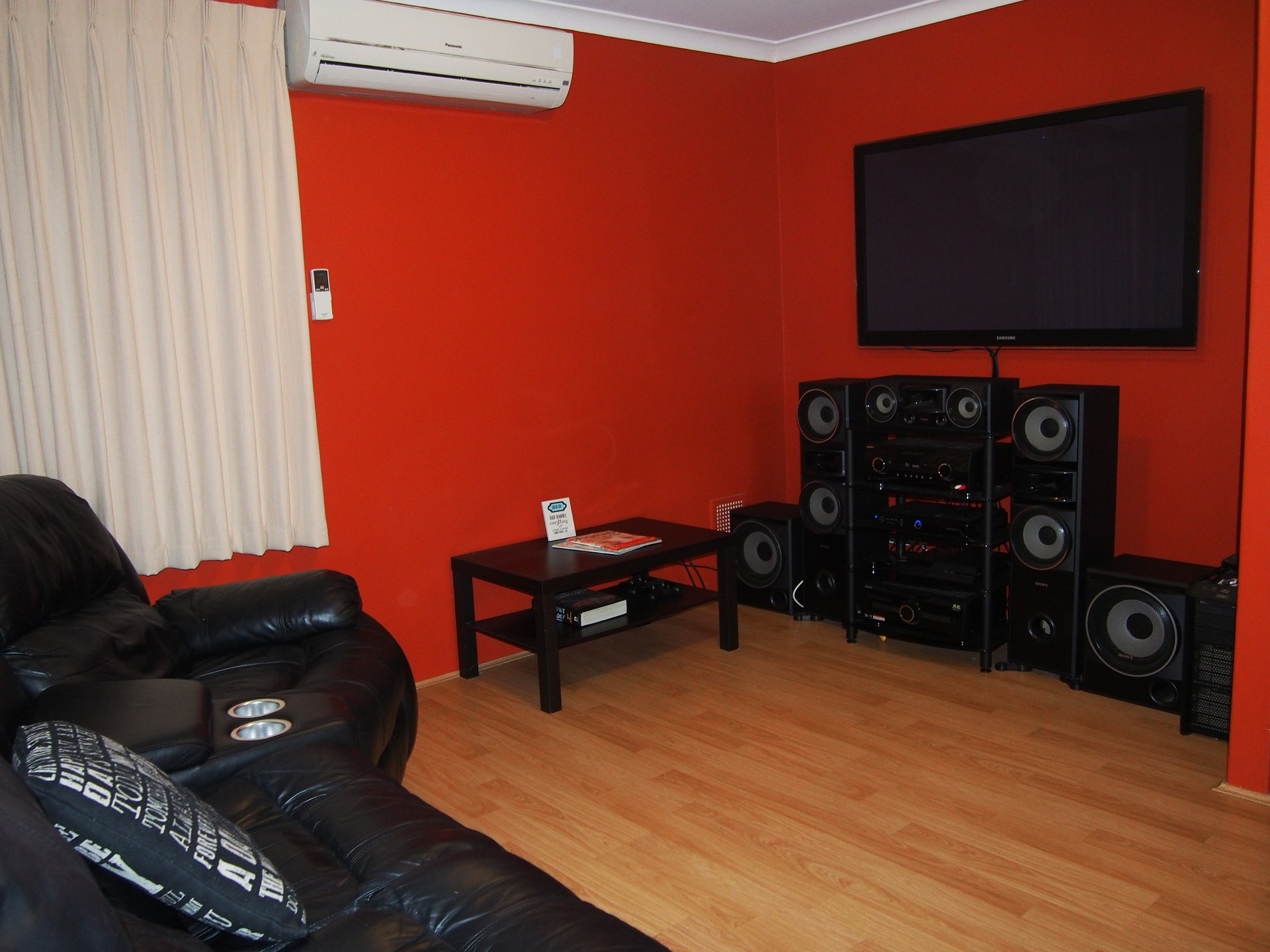 A separated lounge room is perfect for a home theatre system and has an air conditioner, gas points, and curtains over blinds to ensure a dark theatre experience.