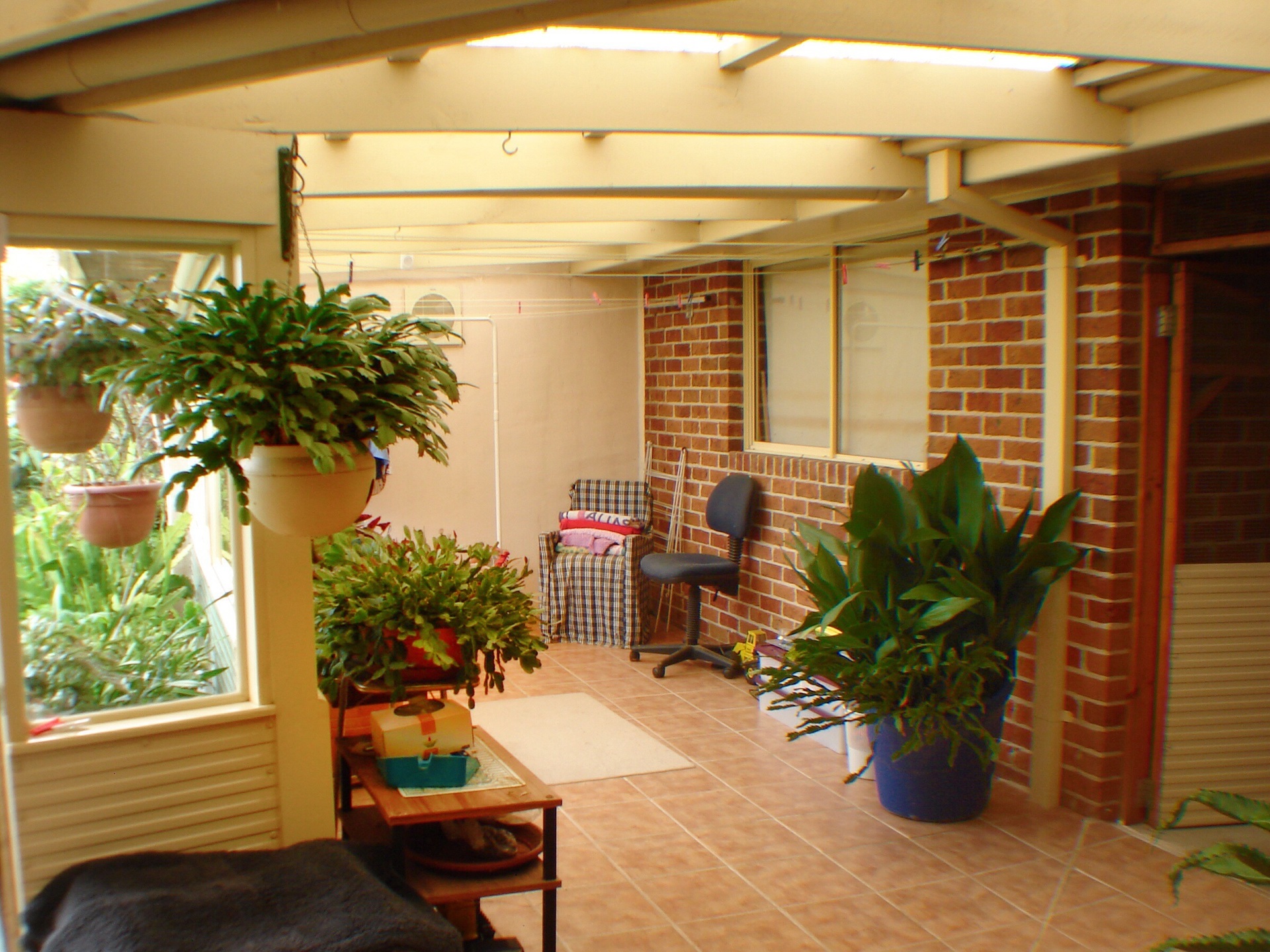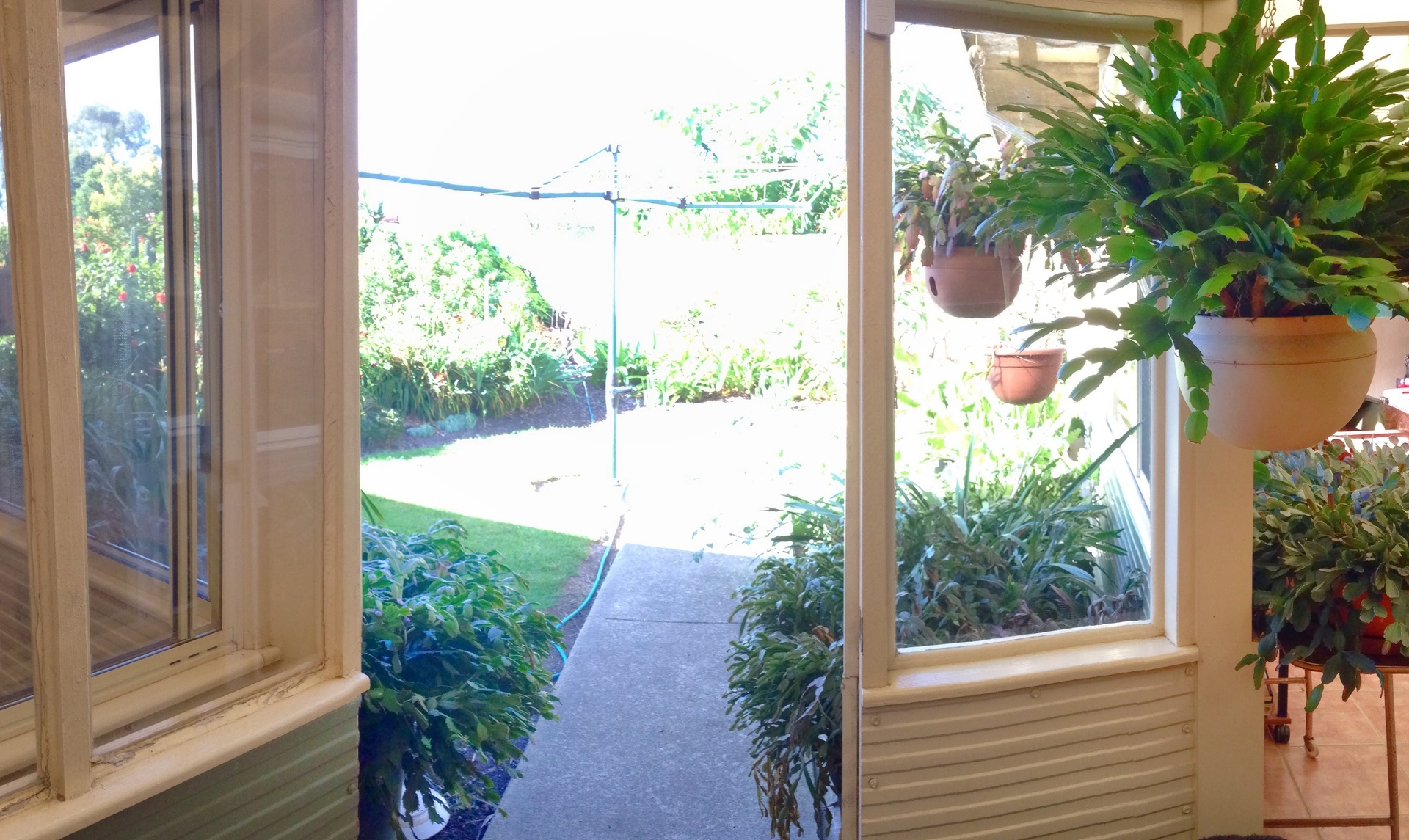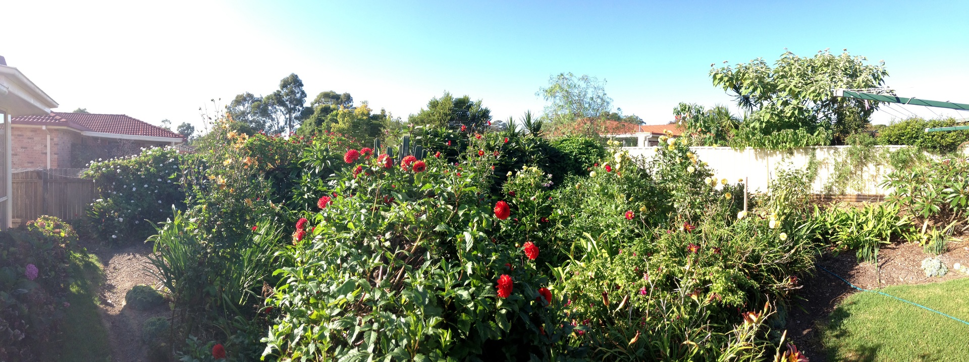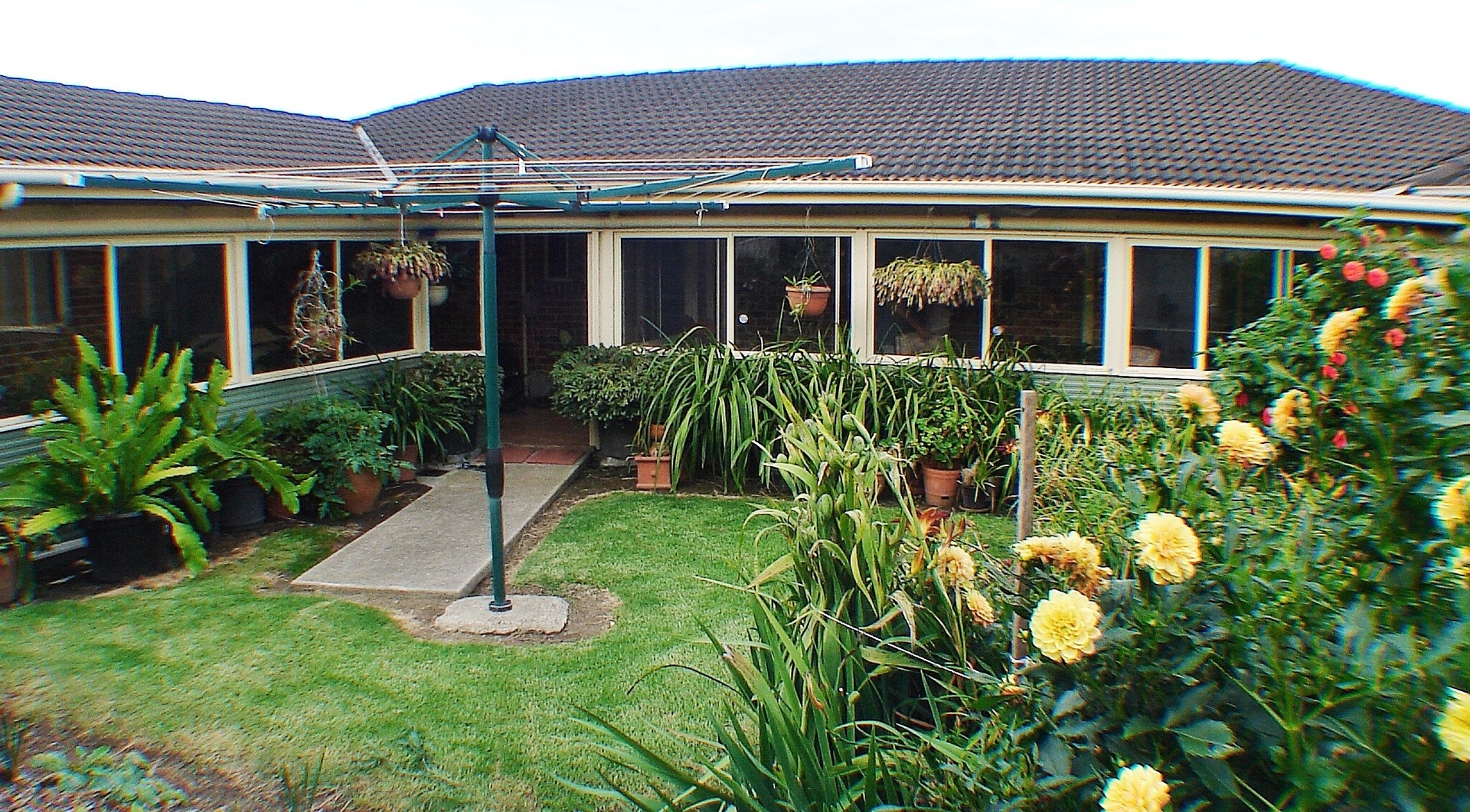 Dual 1500 litre water tanks and downpipe water diverters keep this low maintenance garden green.
