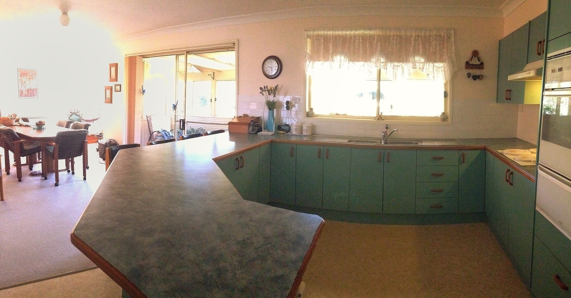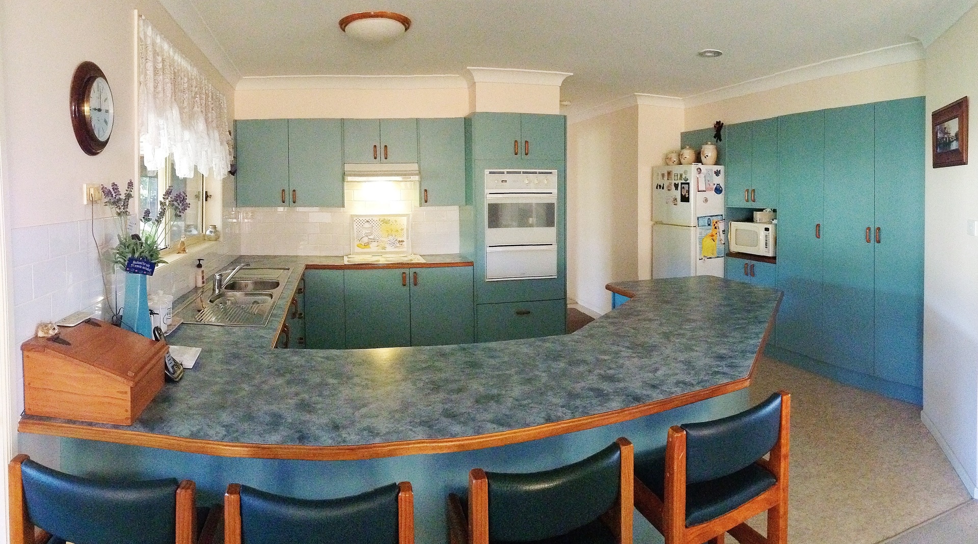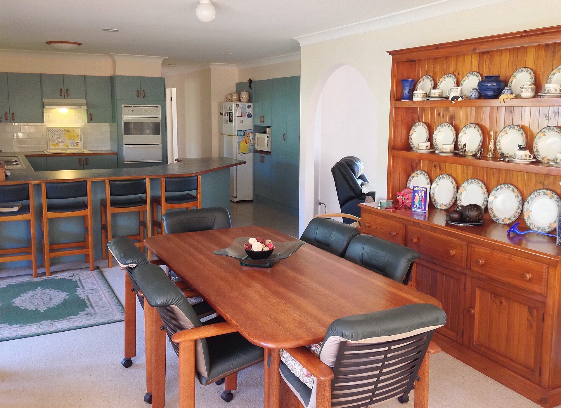 The large kitchen has ample storage and bench space to spare. The kitchen bench easily fits 8 seated adults and can fulfill a dual role of breakfast bar/food prep area.