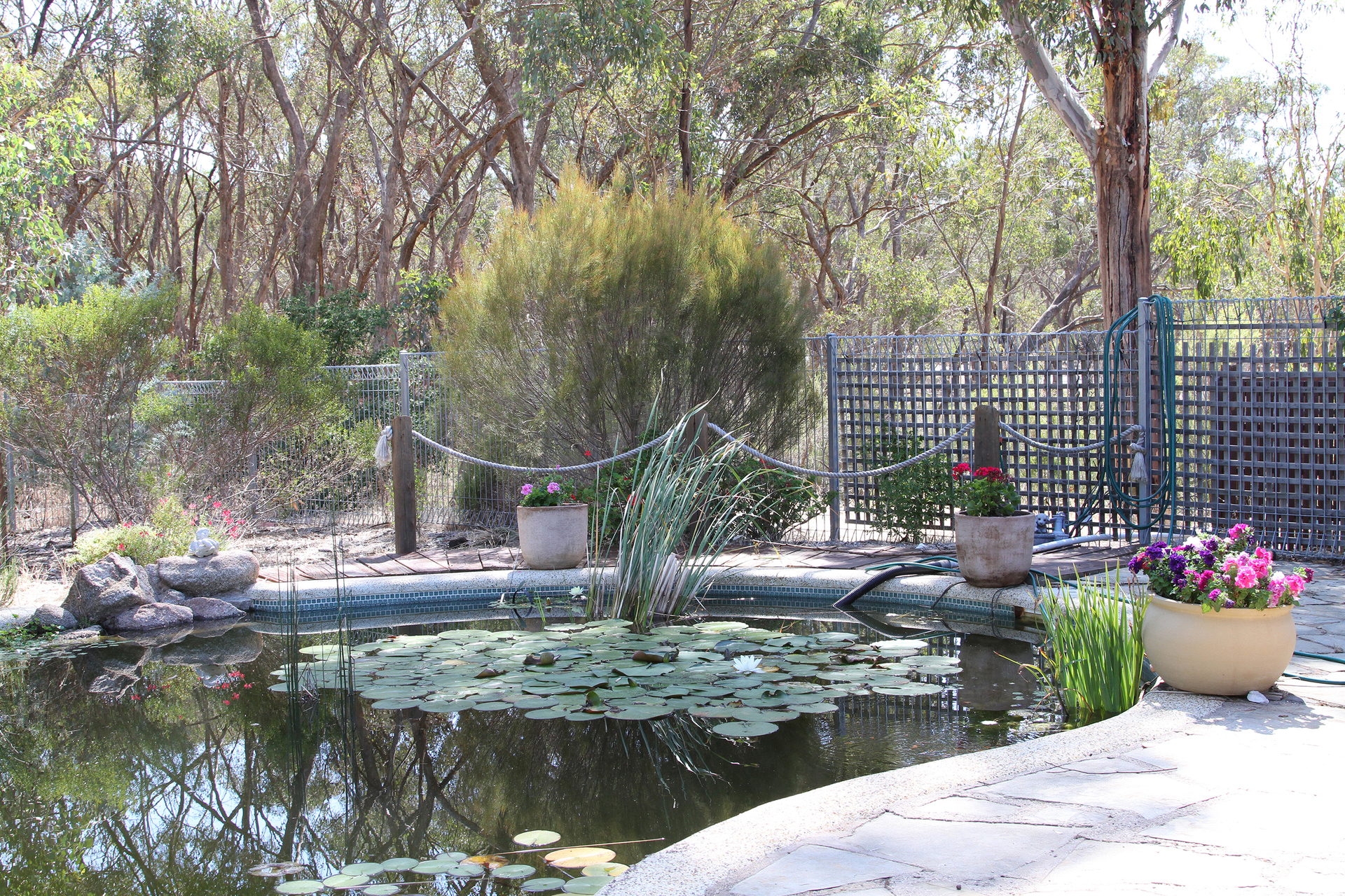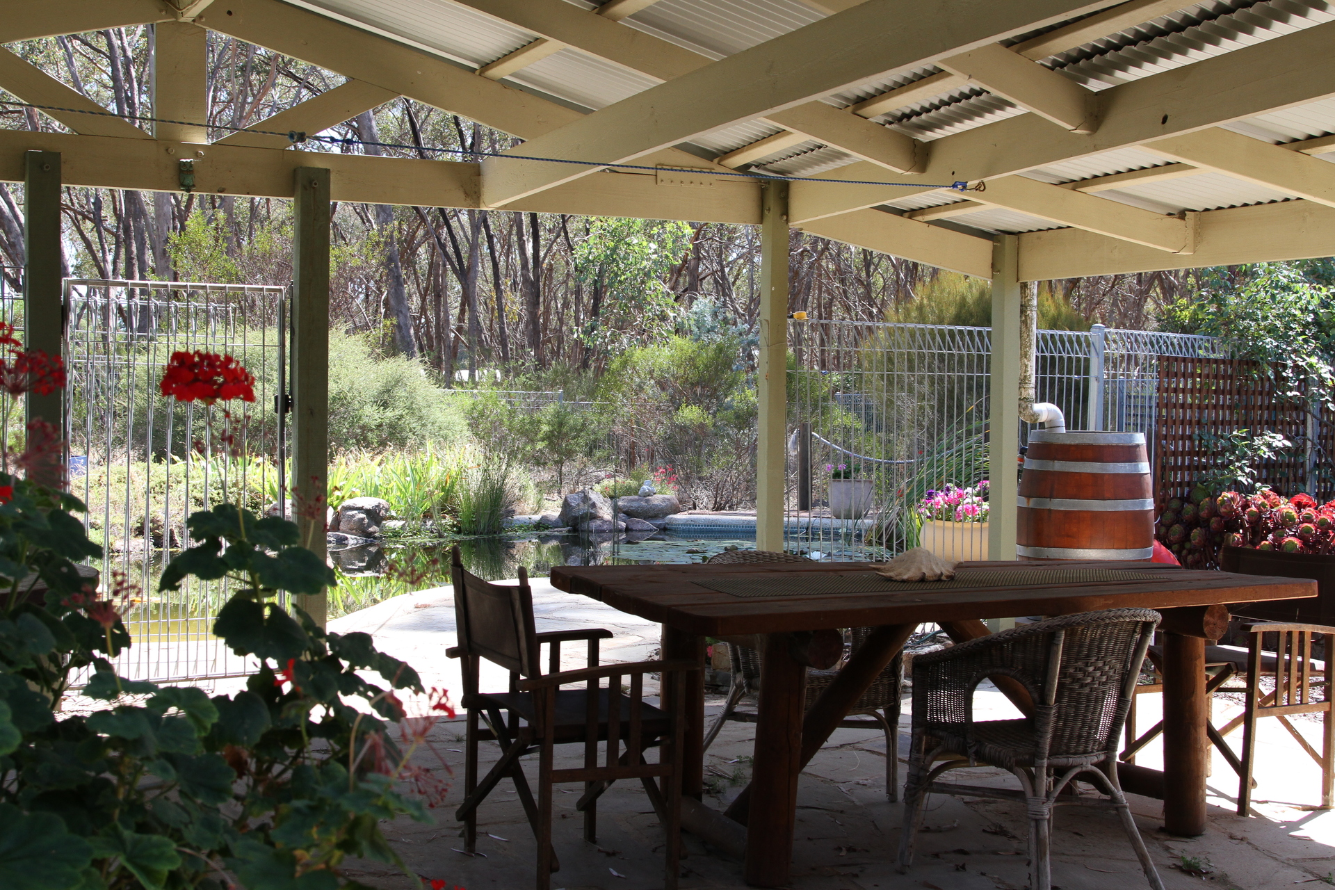 The property could support several horses or other animals. There’s an ideal area for chooks, right next to the well established organic vegetable garden which has been steadily enriched for over four years. The swimming pool has been transformed into an edible fish pond, yet could be easily converted back to a pool.