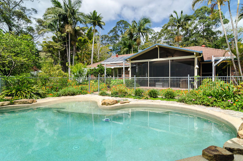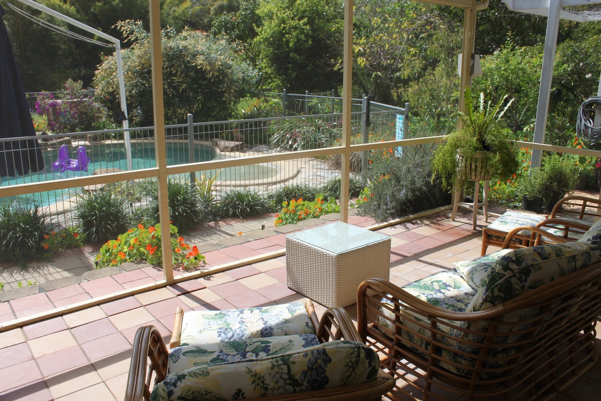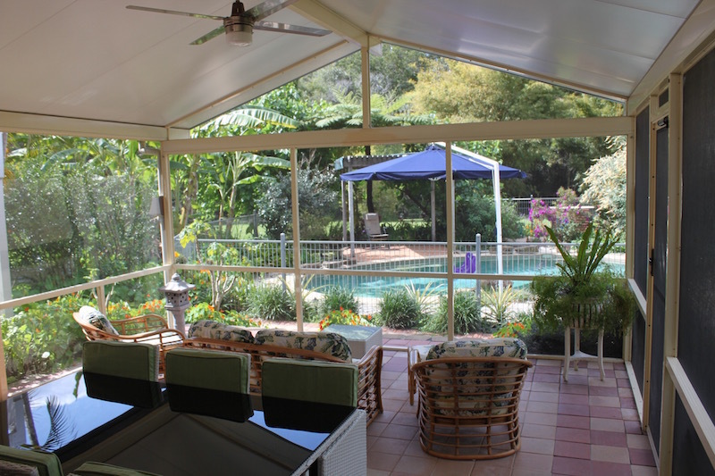 Walking out from the living area is an attached large 5 x 5.5 m screened A framed room overlooking a beautiful freshwater ionised tropical pool and surrounding gardens.