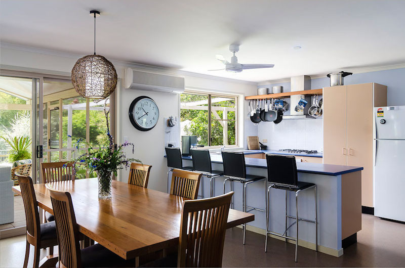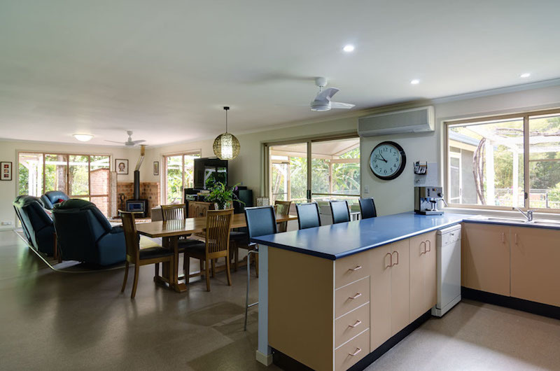 To add to its low energy and environmental impact rating, this north east facing house includes 2.1 kW solar system, solar hot water, roof insulation, additional solar shed panels for battery recharging, a wood combustion heater with own property wood supply, 96 000 litres (cement tanks) of rainwater, an ionised swimming pool, 3 dams for irrigation, a fully automated irrigation system to fruit trees and vegetable gardens and a beautiful rainforest fringed swimming dam with its own jetty. This adjoins 2 creeks filled with birds and other wildlife.