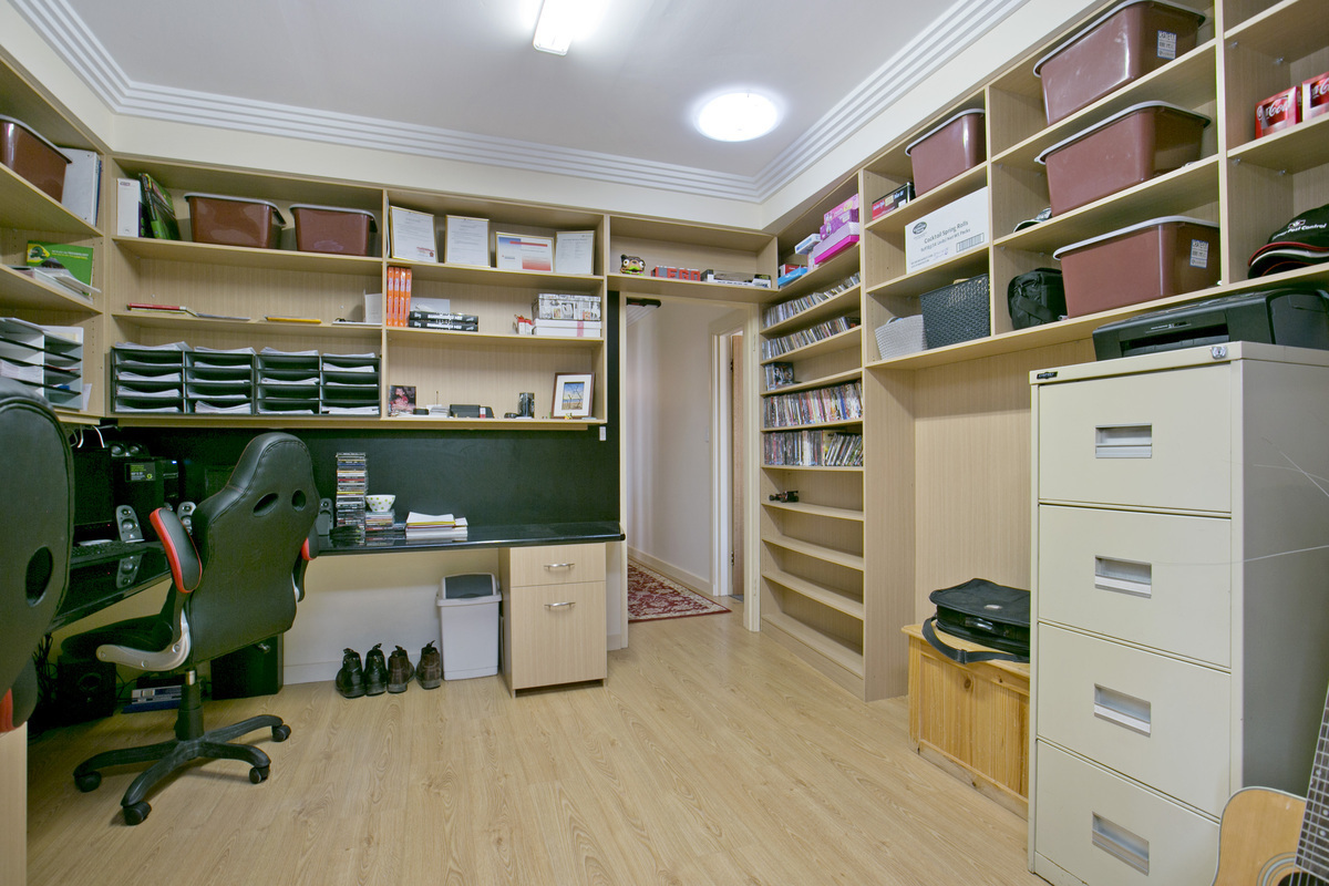 With a dedicated office with floor to ceiling built in shelving and storage, this room is large enough for any home office.