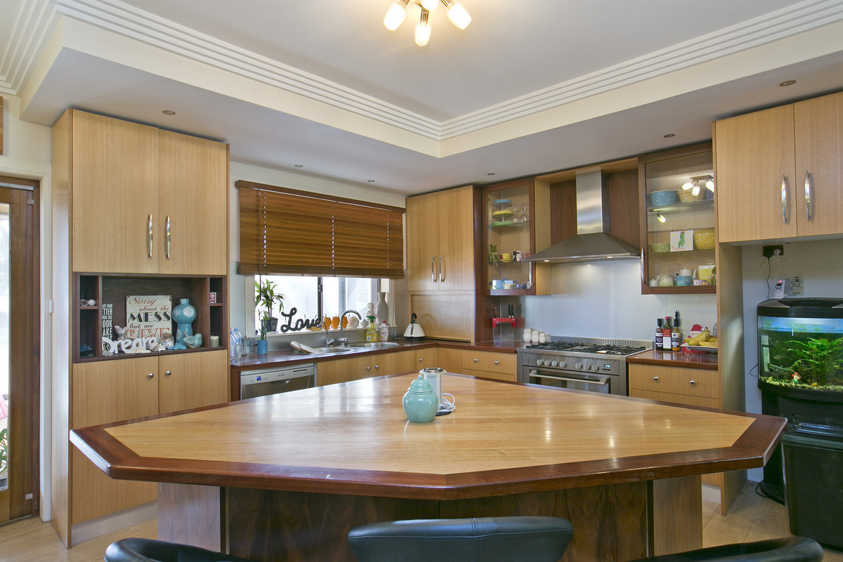 The large modern kitchen has everything you need & features solid Tasmanian Oak & Jarrah bench tops, huge pantry storage, F/S gas cooker and huge Island unit.