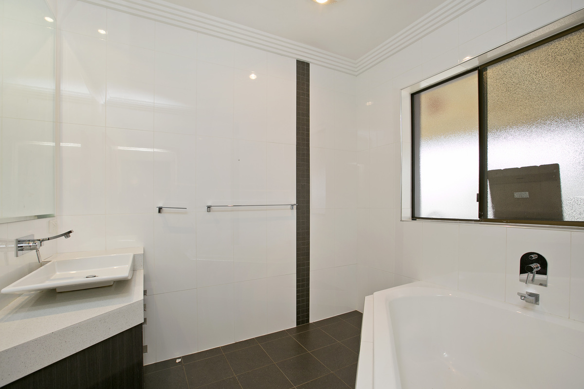 Moving down the hallway you will find the laundry and master bathroom, laundry with ample storage and outdoor access. The main bathroom features a large corner bath with shower above & separate wc.