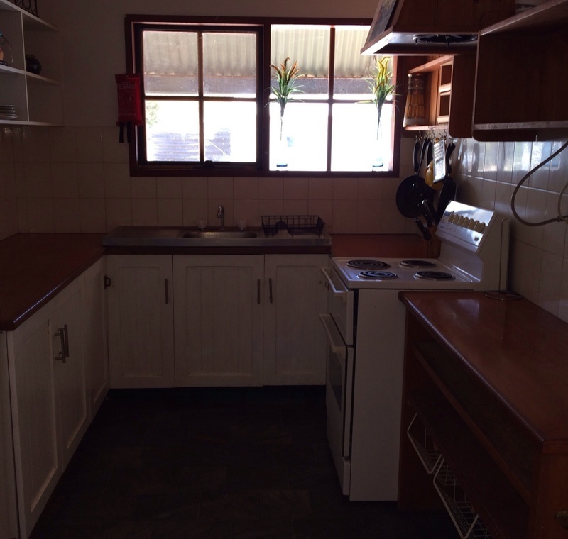 Kitchen features wooden bench tops & cupboards with electric oven.
