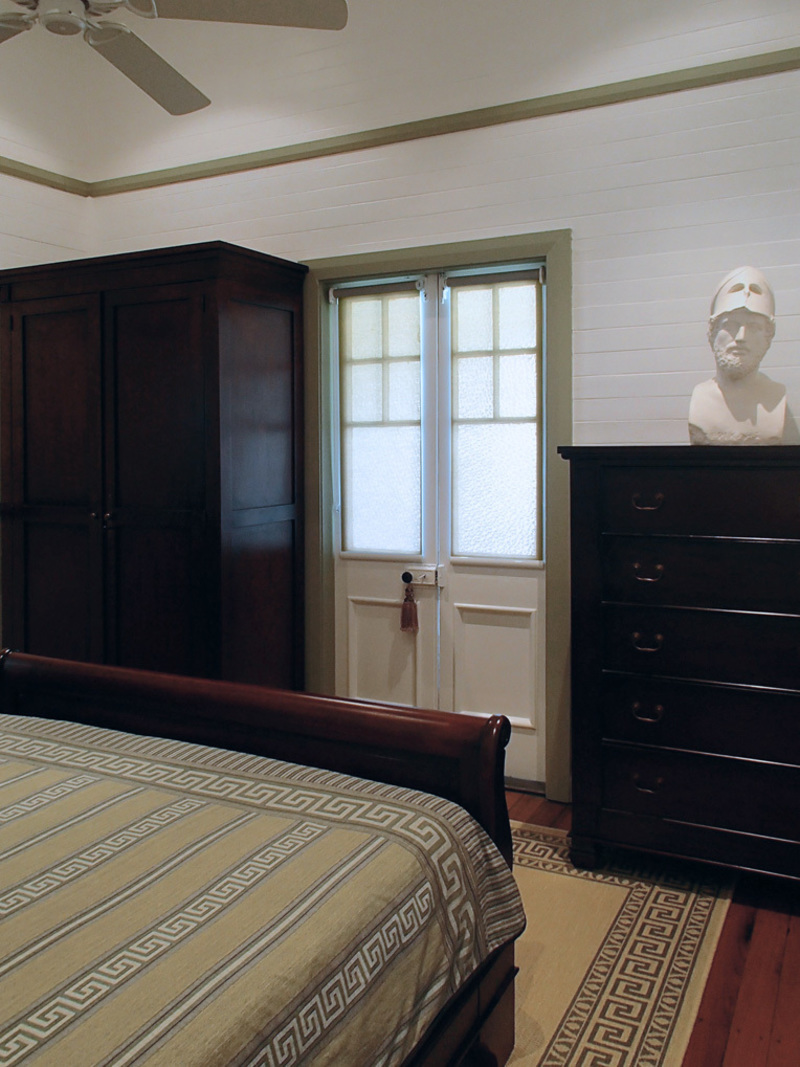Bedroom 2 with French doors and ceiling fan (with direct bathroom access)