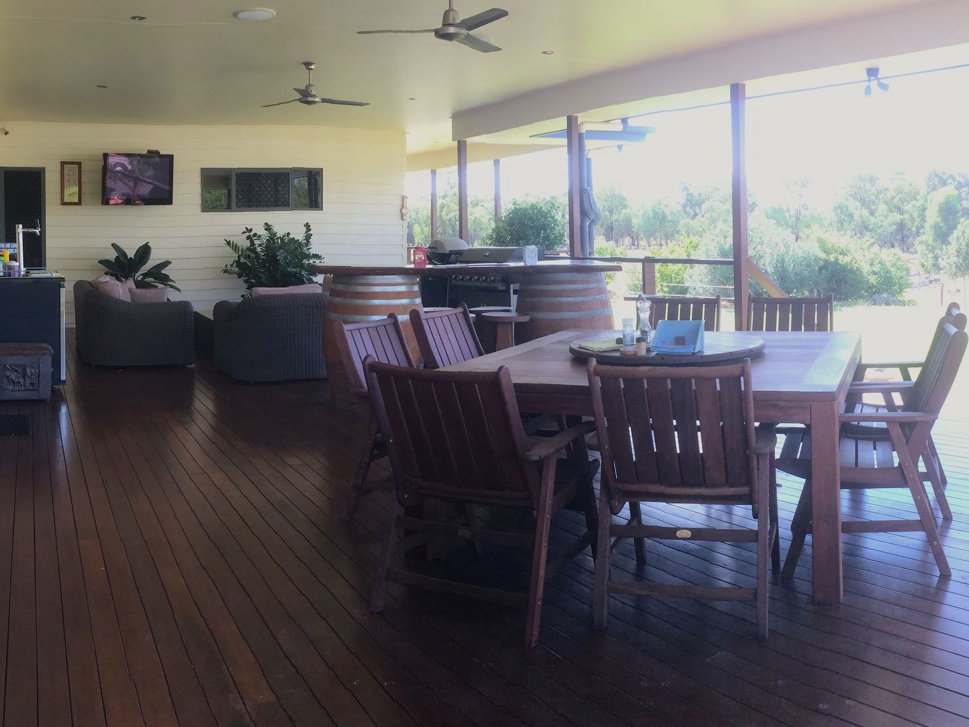 The glorious 11 x 7m deck area at the rear is an entertaining/relaxation haven with plenty of room for full lounge, bar and 8 seater table. Two large ceiling fans will keep you and your guests cool while enjoying your views privately. There is two Gas lines plumbed from the main house cylinders so no worries about running out of Gas for the BBQ's and WeberQ.