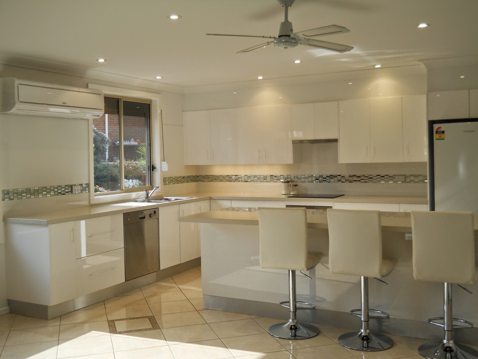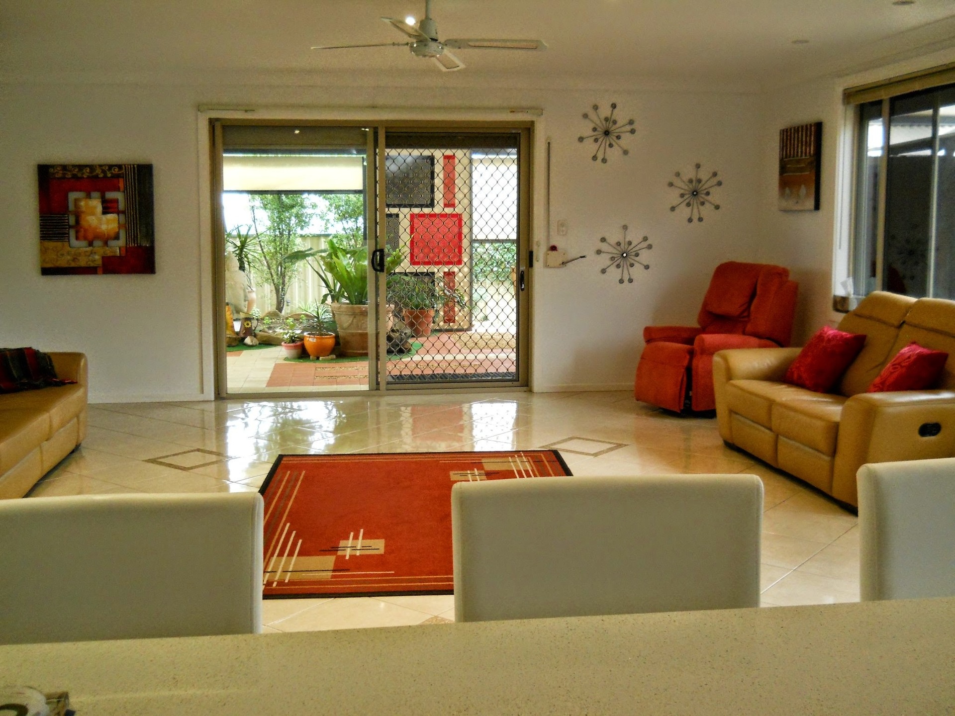 Rollershutters to all glass areas,ceiling fans throughout.