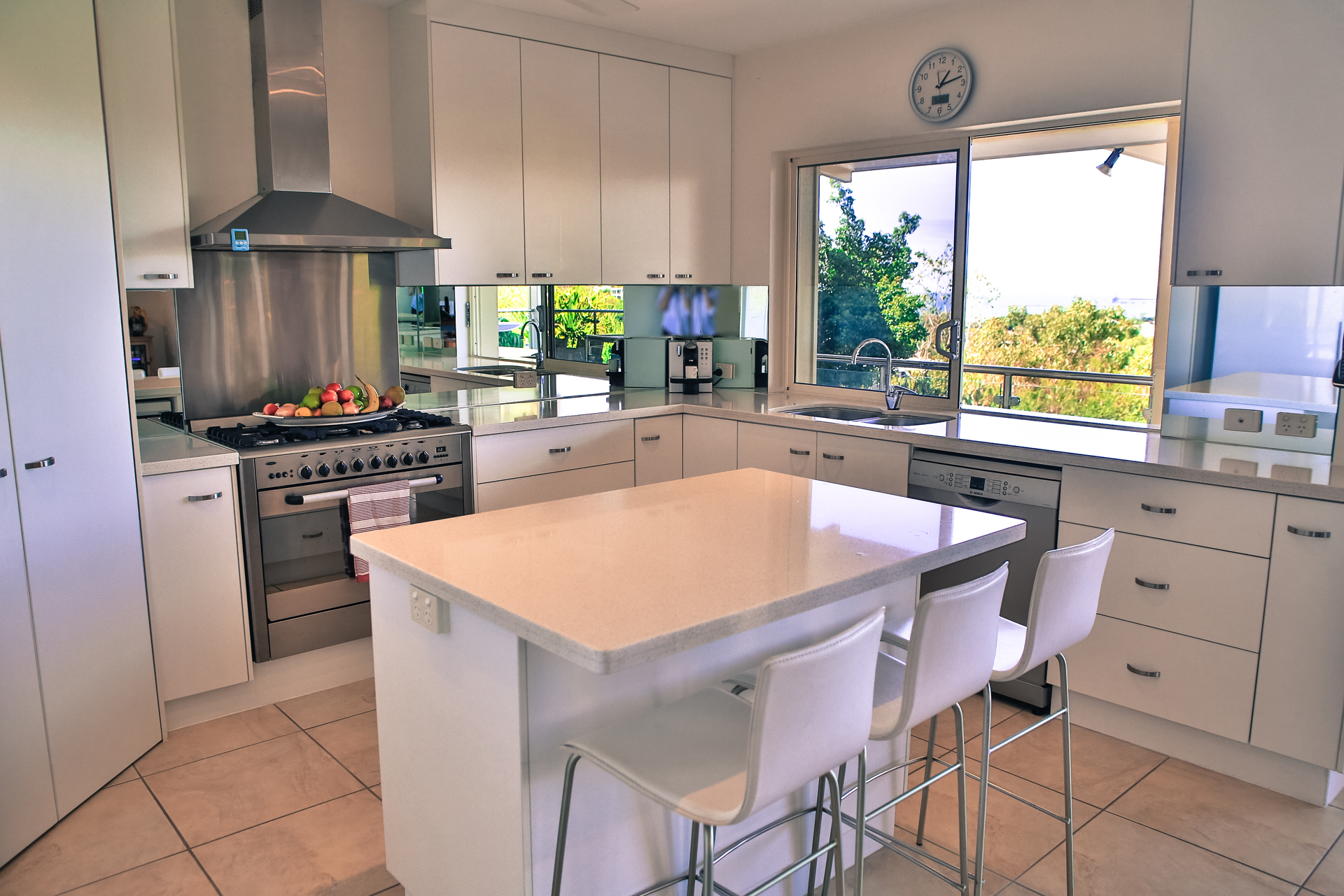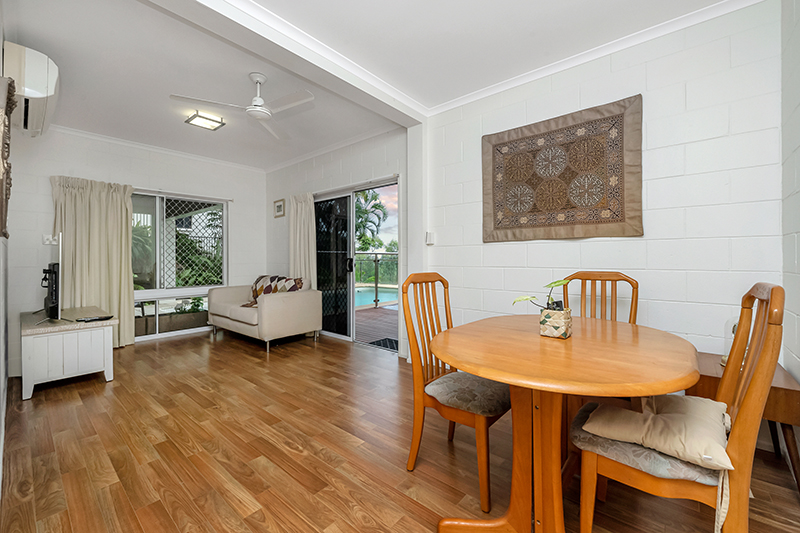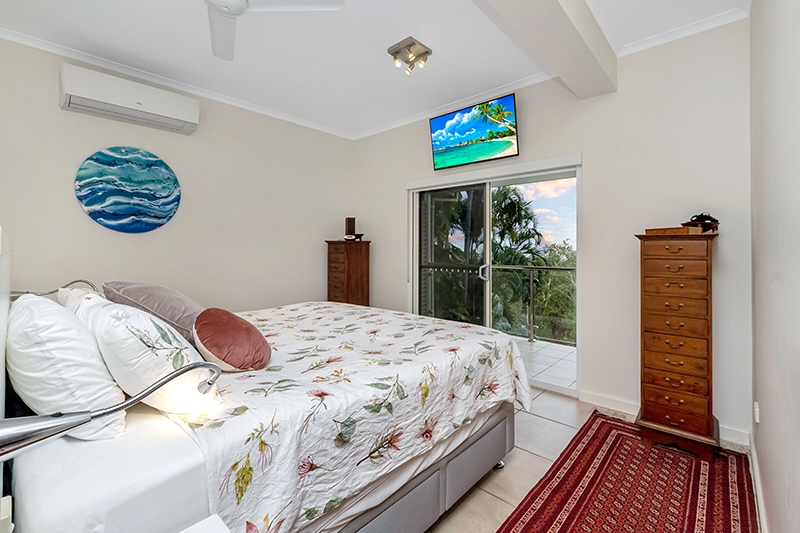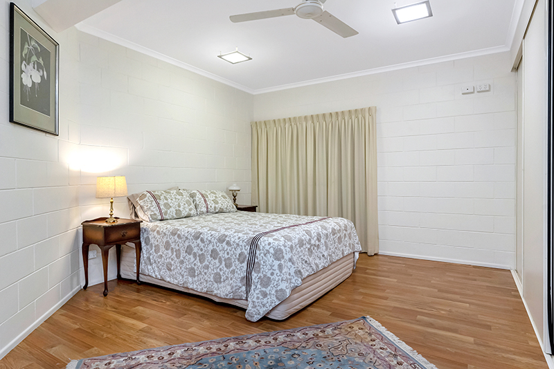 The large master bedroom is on street level with a modern ensuite and large walk-in robe as well as two large wardrobes. The living area overlooks the deck and enjoys views to the City, Castle Hill and Cape Cleveland. The kitchen is equipped with stainless steel appliances and granite bench tops and enjoys the view from the servery to the deck.