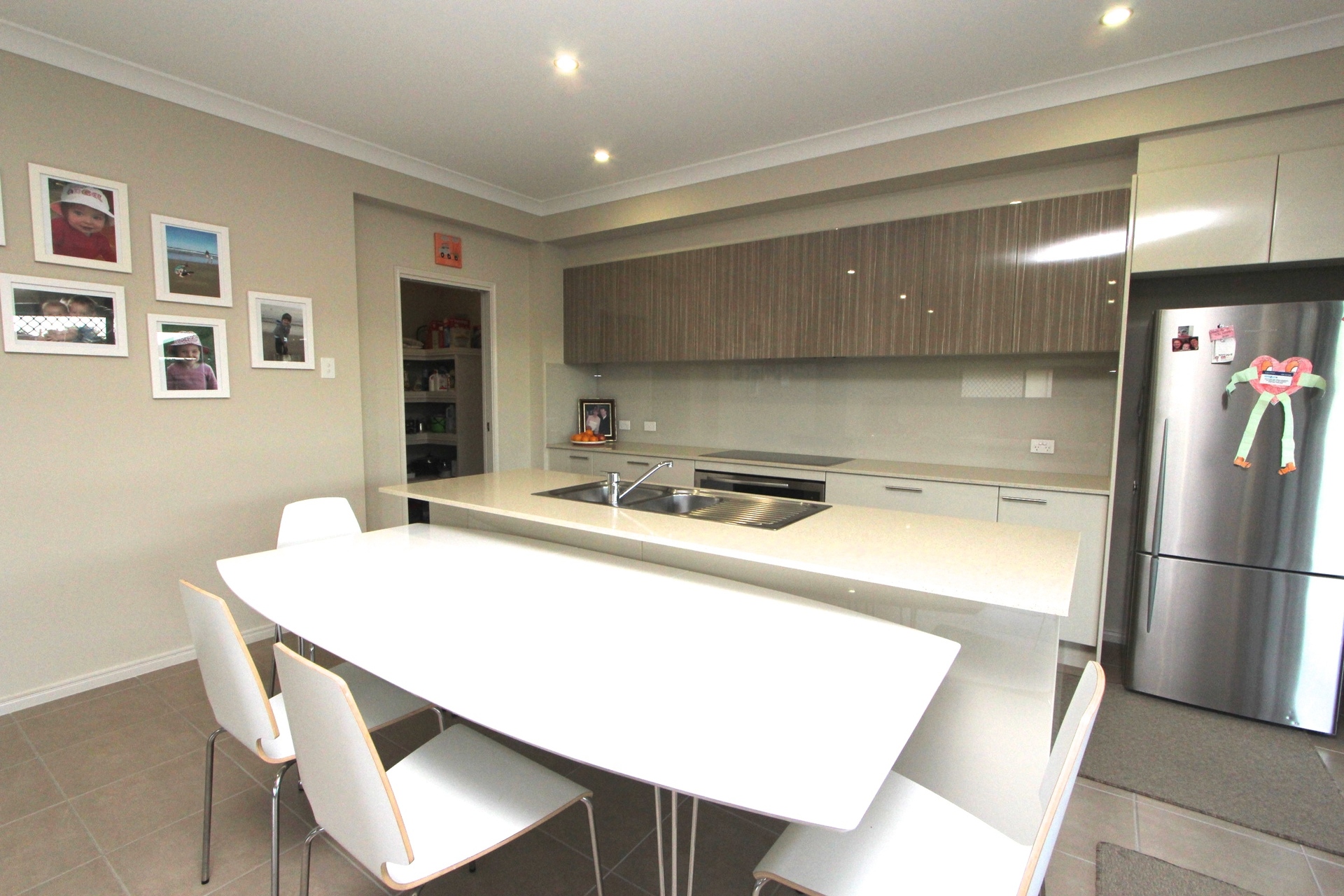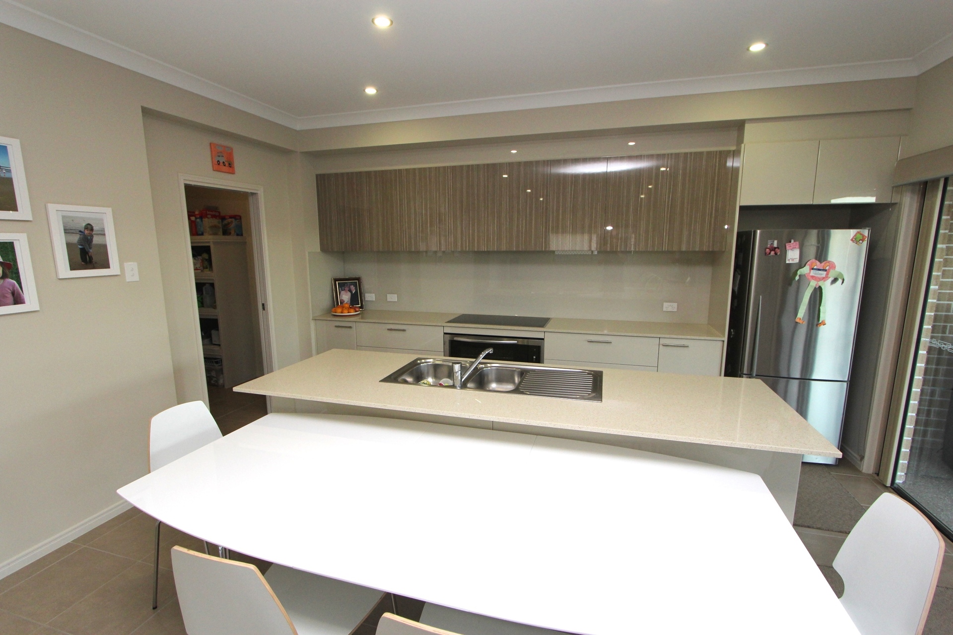 Modern kitchen with glass splash back, stone bench tops, stainless steel appliances and walk in pantry.