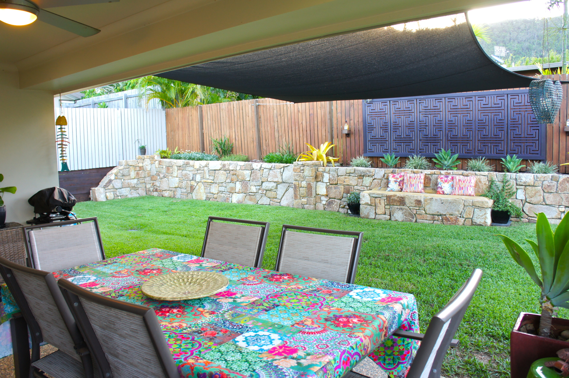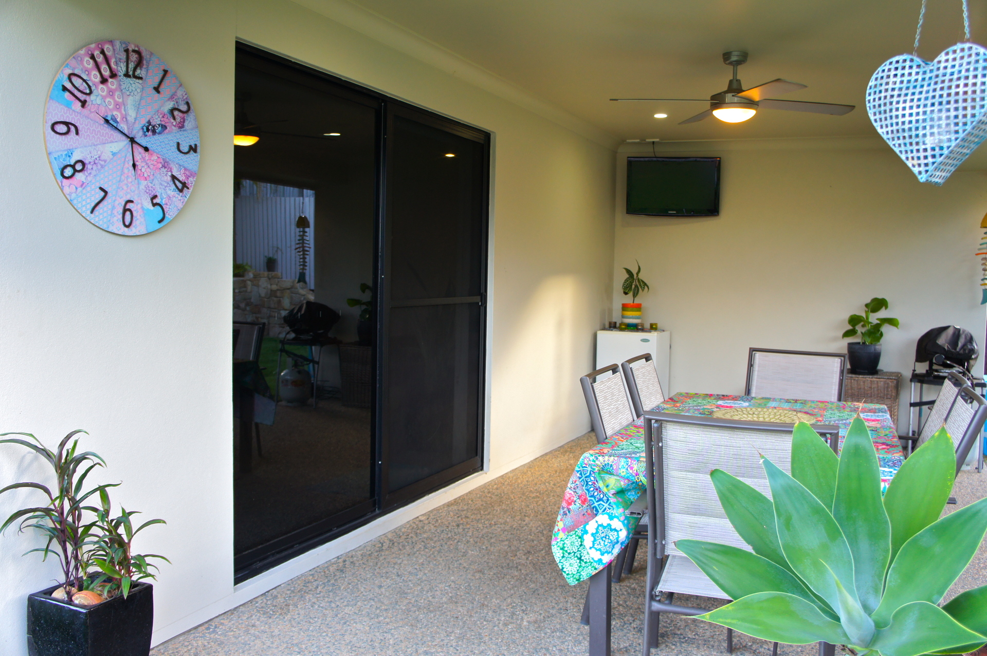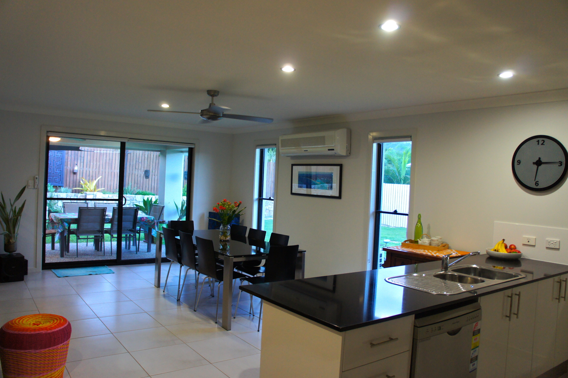 The open plan living area leads straight to the outdoor patio featuring established low maintenance gardens and a unique stone wall.