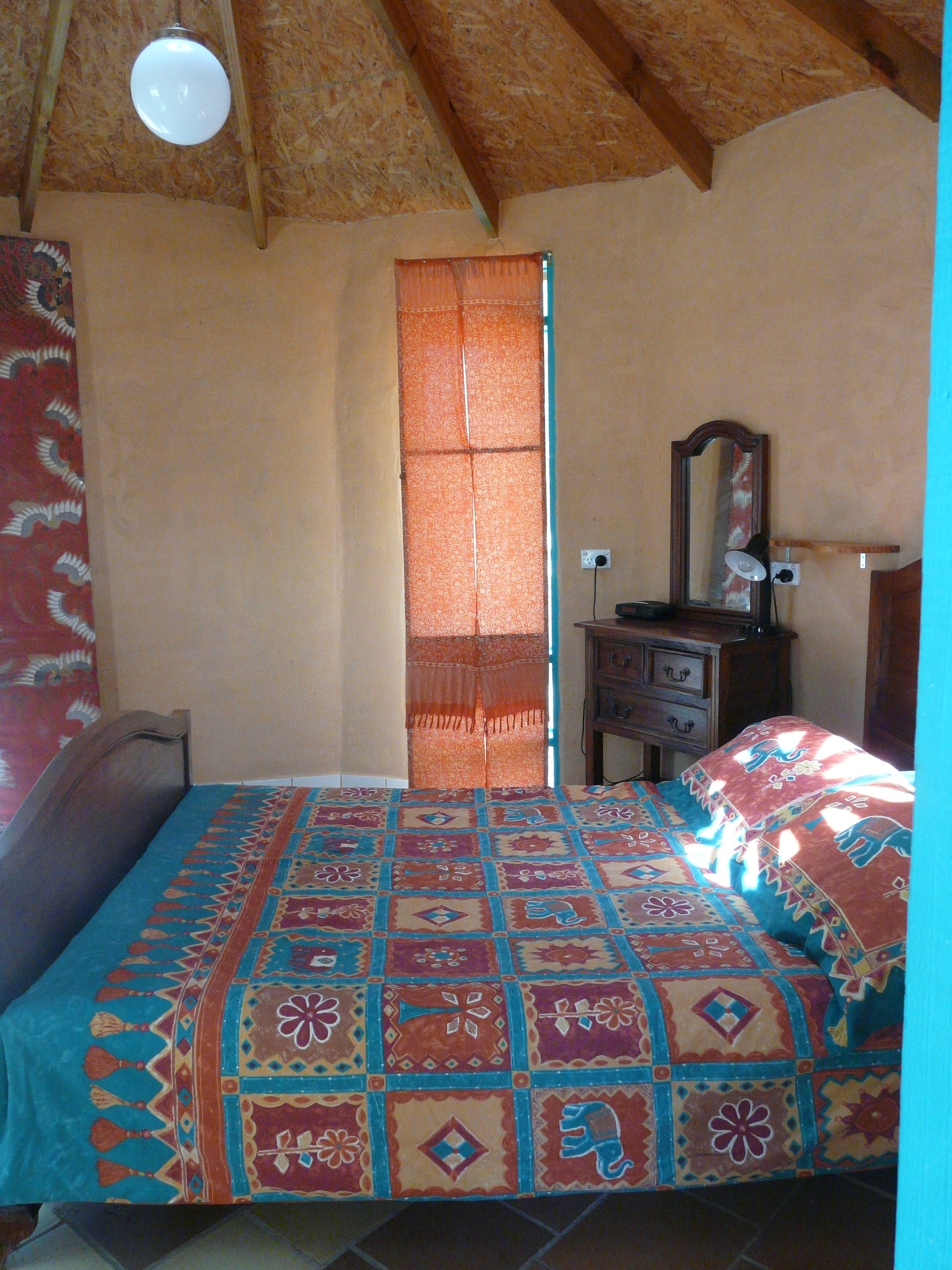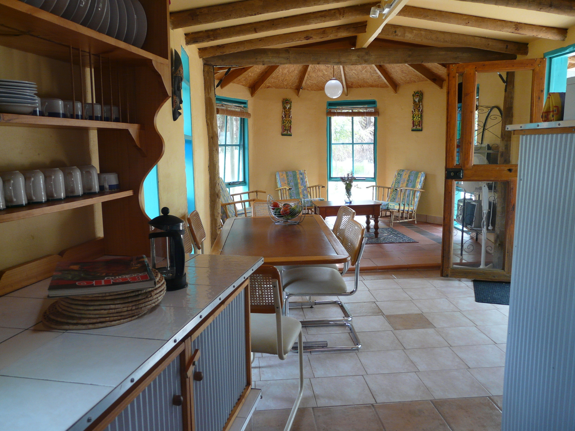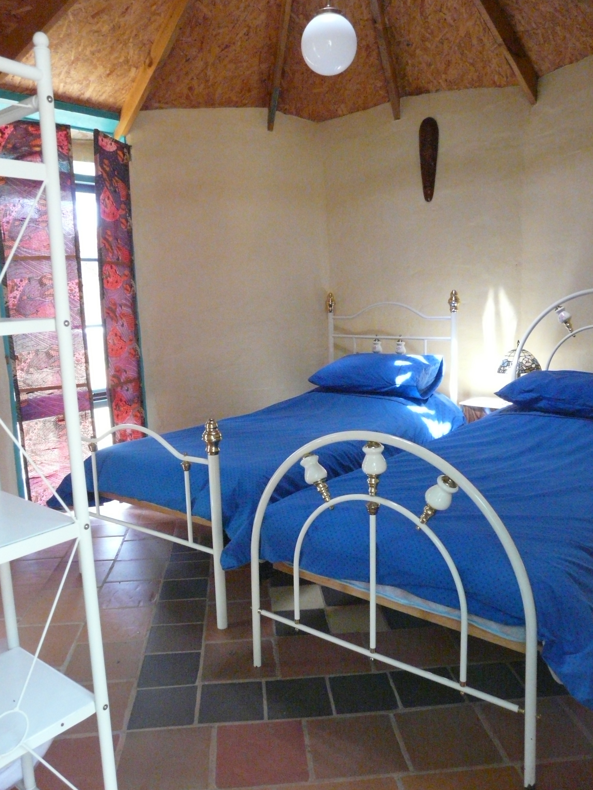 The house has an open planned kitchen, living and dining areas in one building. There are three bedrooms one of which is quite small.All bedrooms are in separate round "pods" which are adjoined by a courtyard giving privacy to each space.Each has a few steps outside to the shared living space and central bathroom.