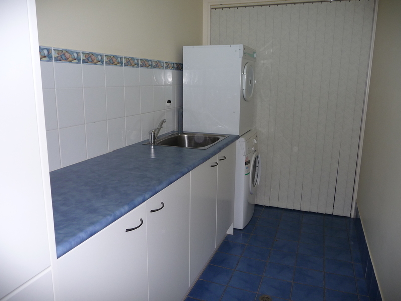 Laundry has double door broom cupboard with storage shelves & 4 door storage cupboards, a glass sliding door leads to the clothes line.