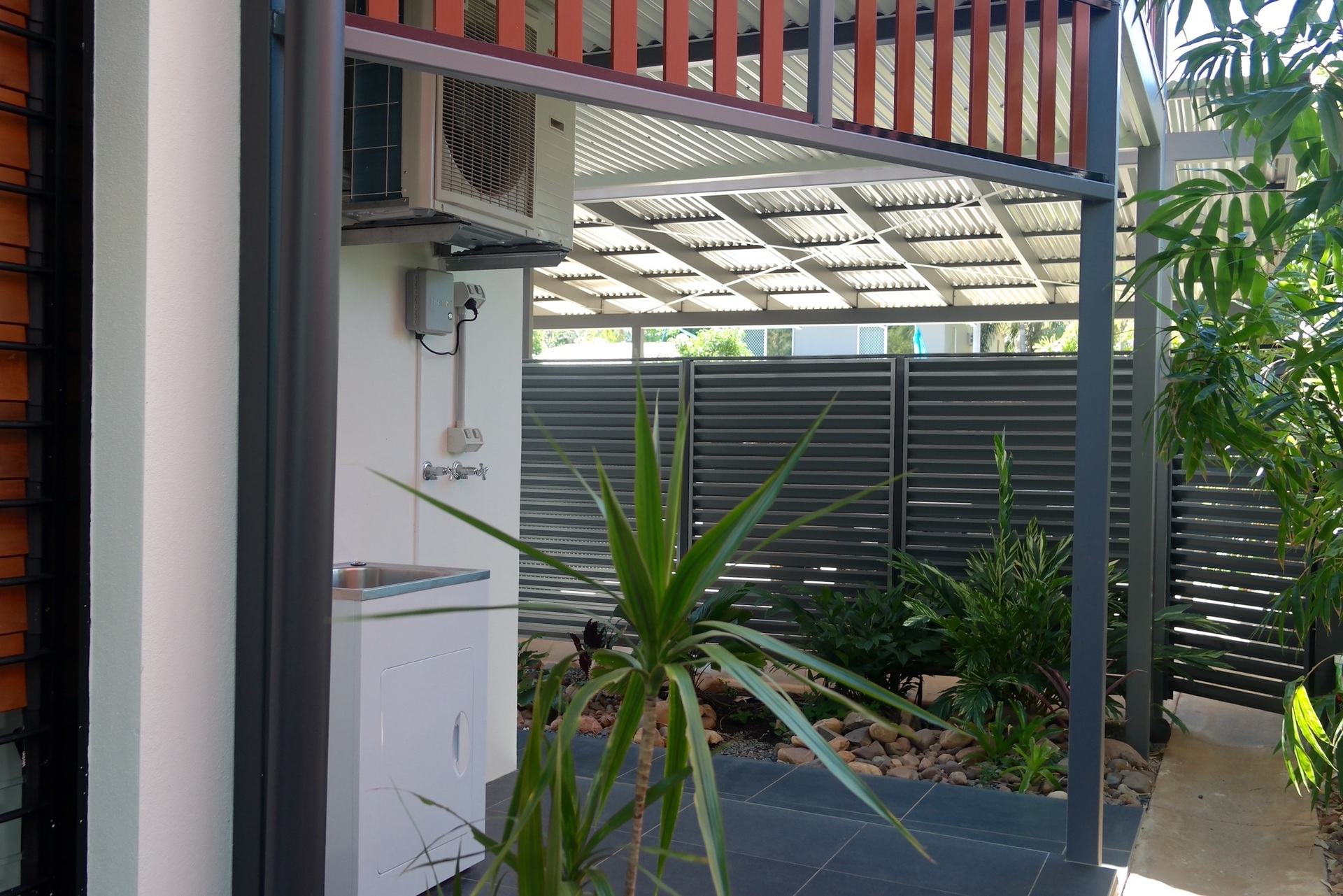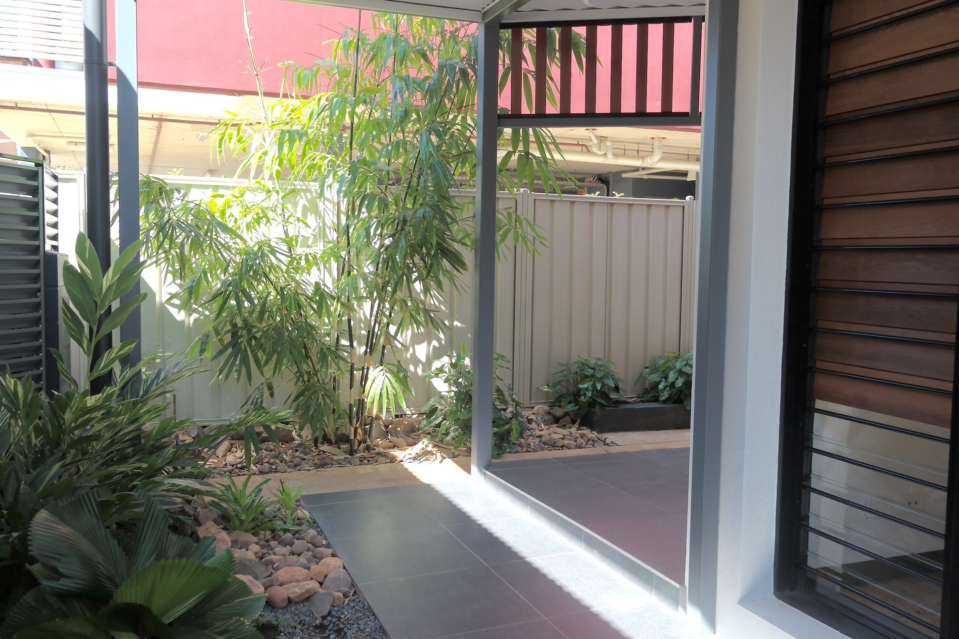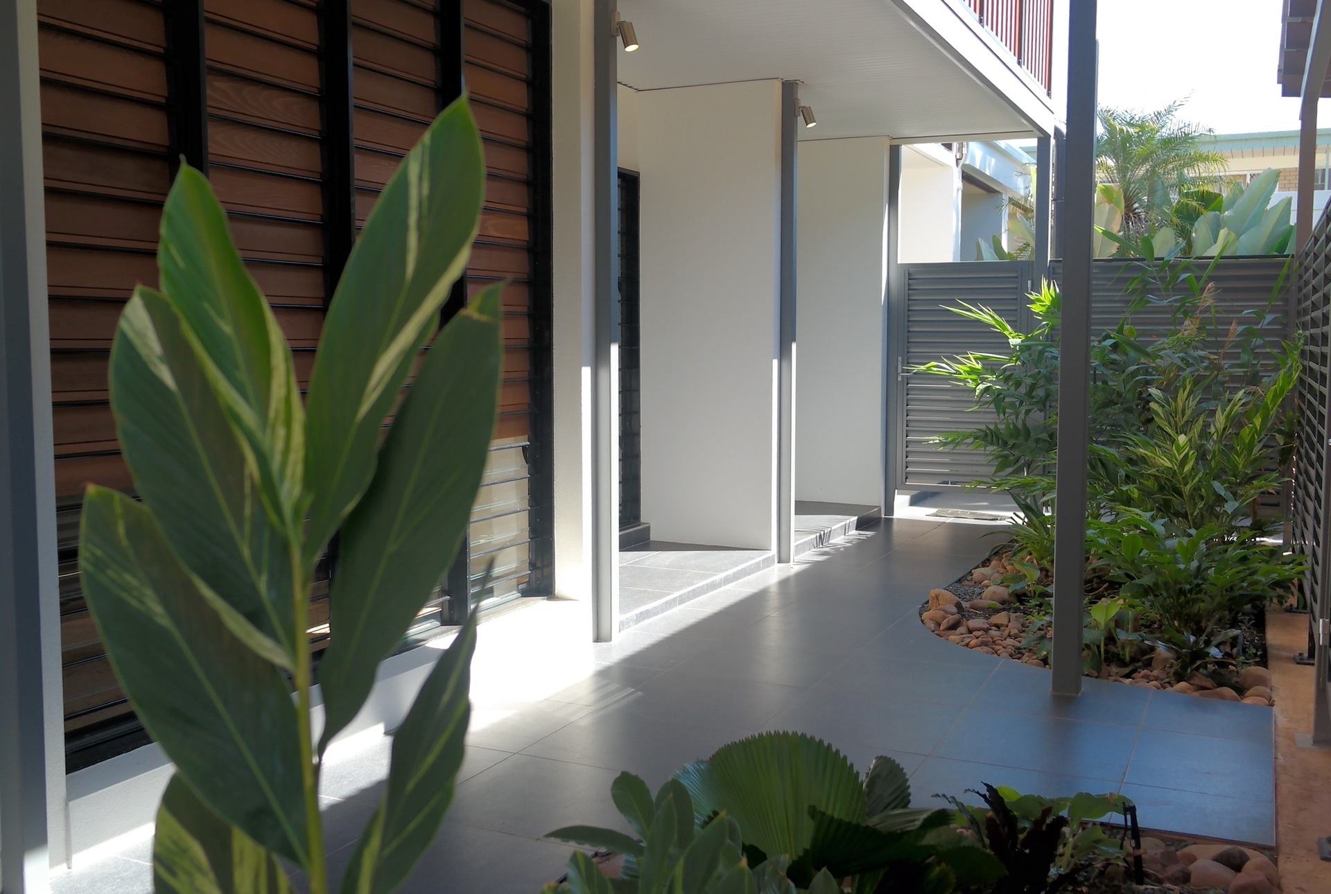 Lockable gates in aluminium louvred privacy screens give you access from the carport and walkway to your front entrance courtyard - once again lushly gardened.