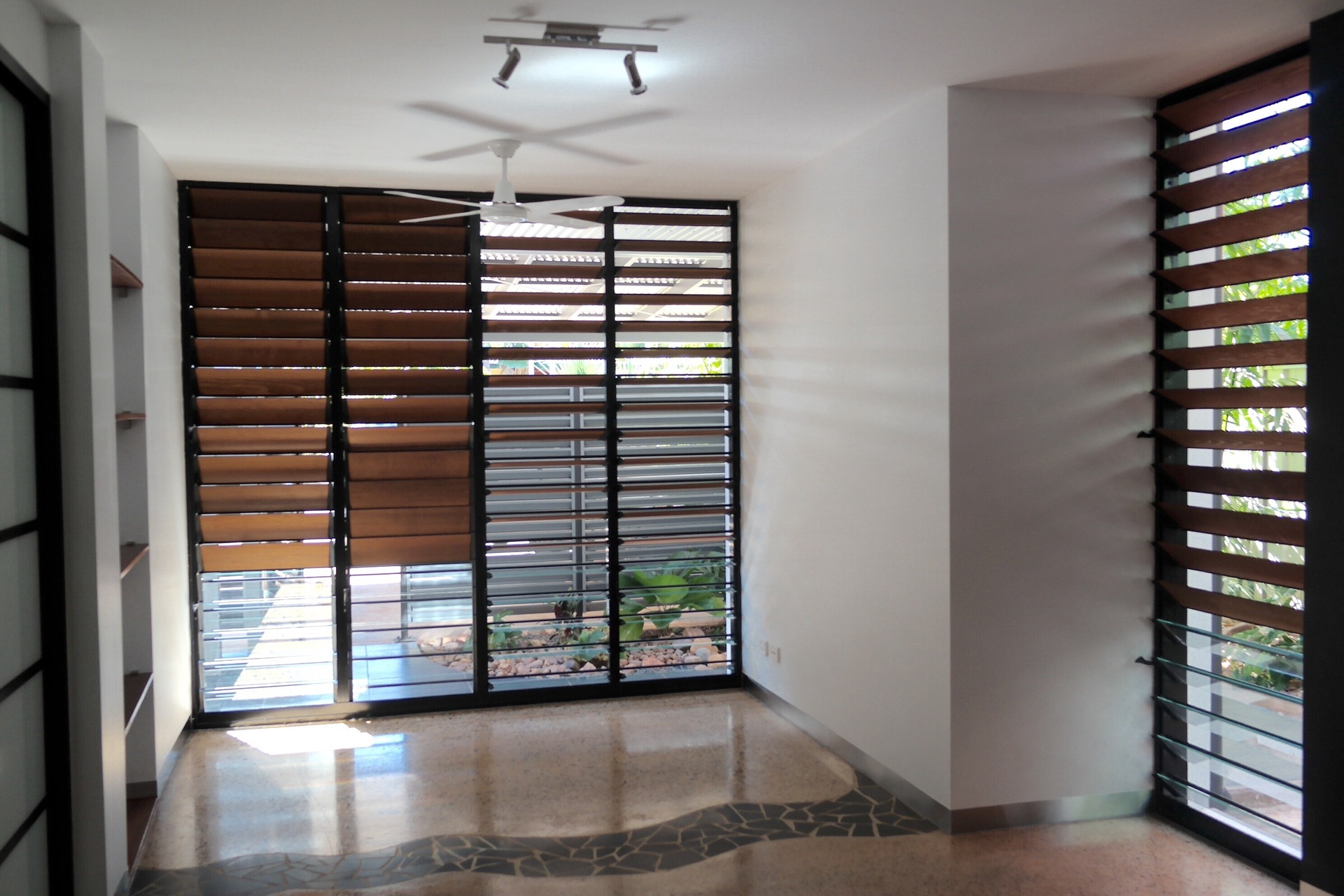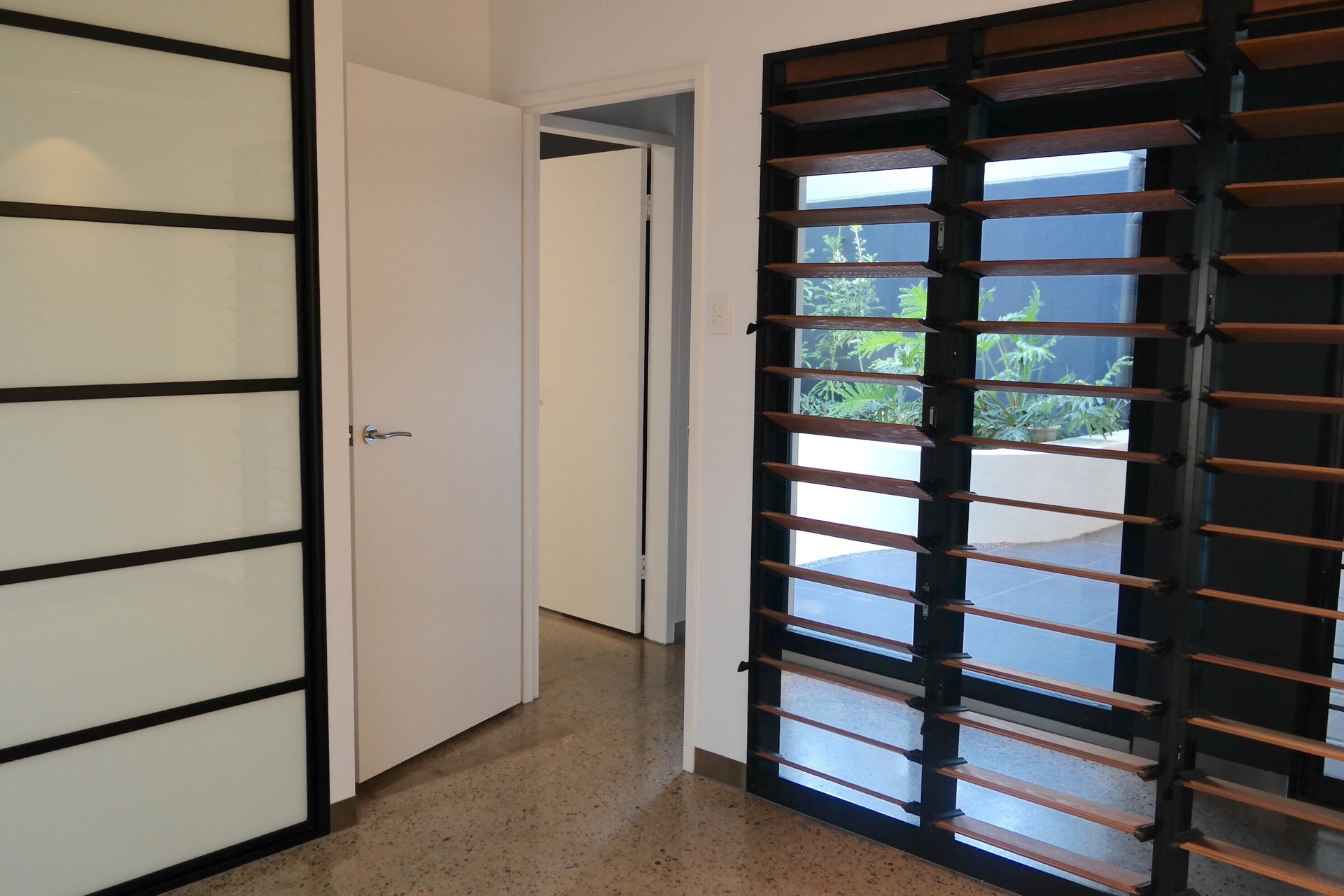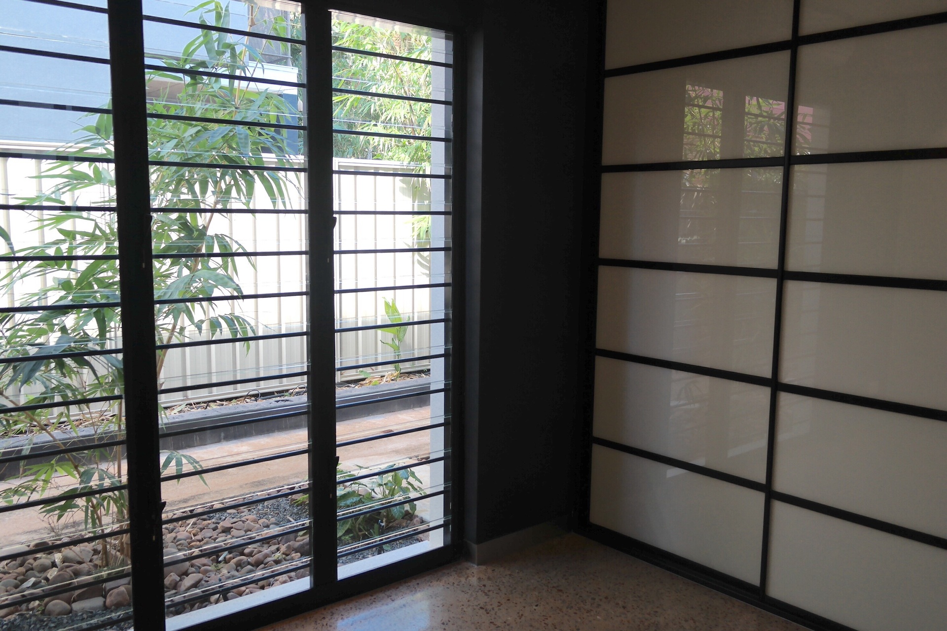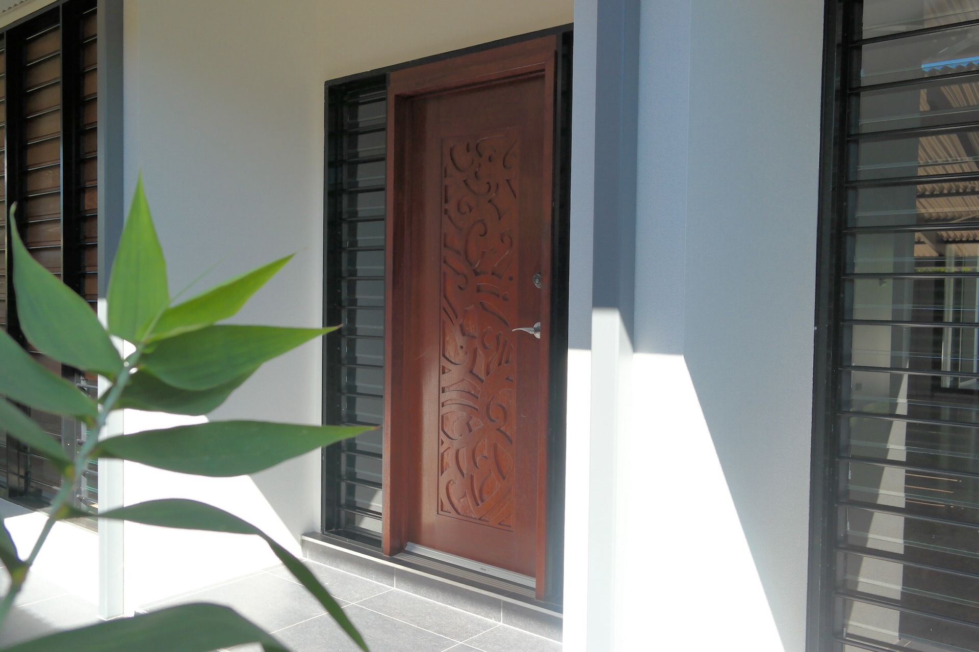 Lockable gates in aluminium louvred privacy screens give you access from the carport and walkway to your front entrance courtyard - once again lushly gardened.