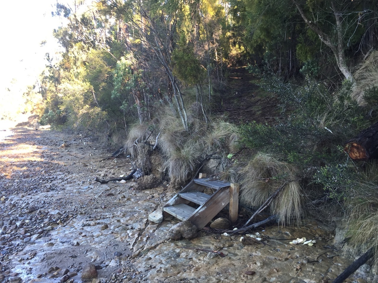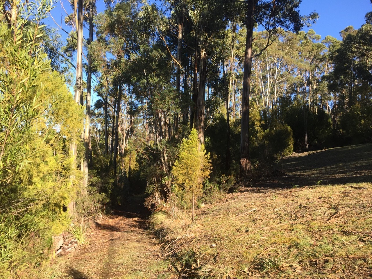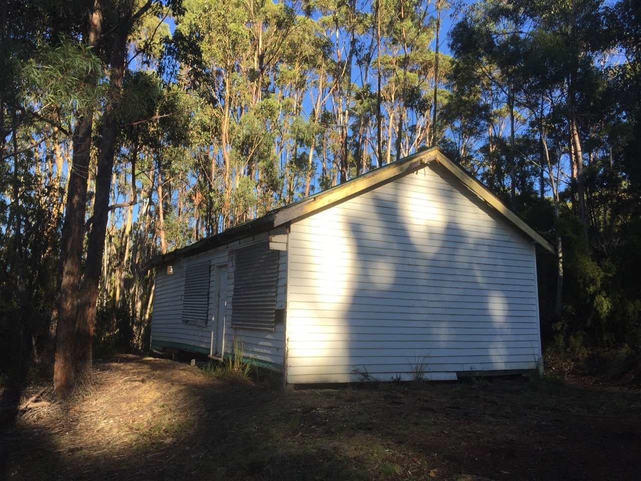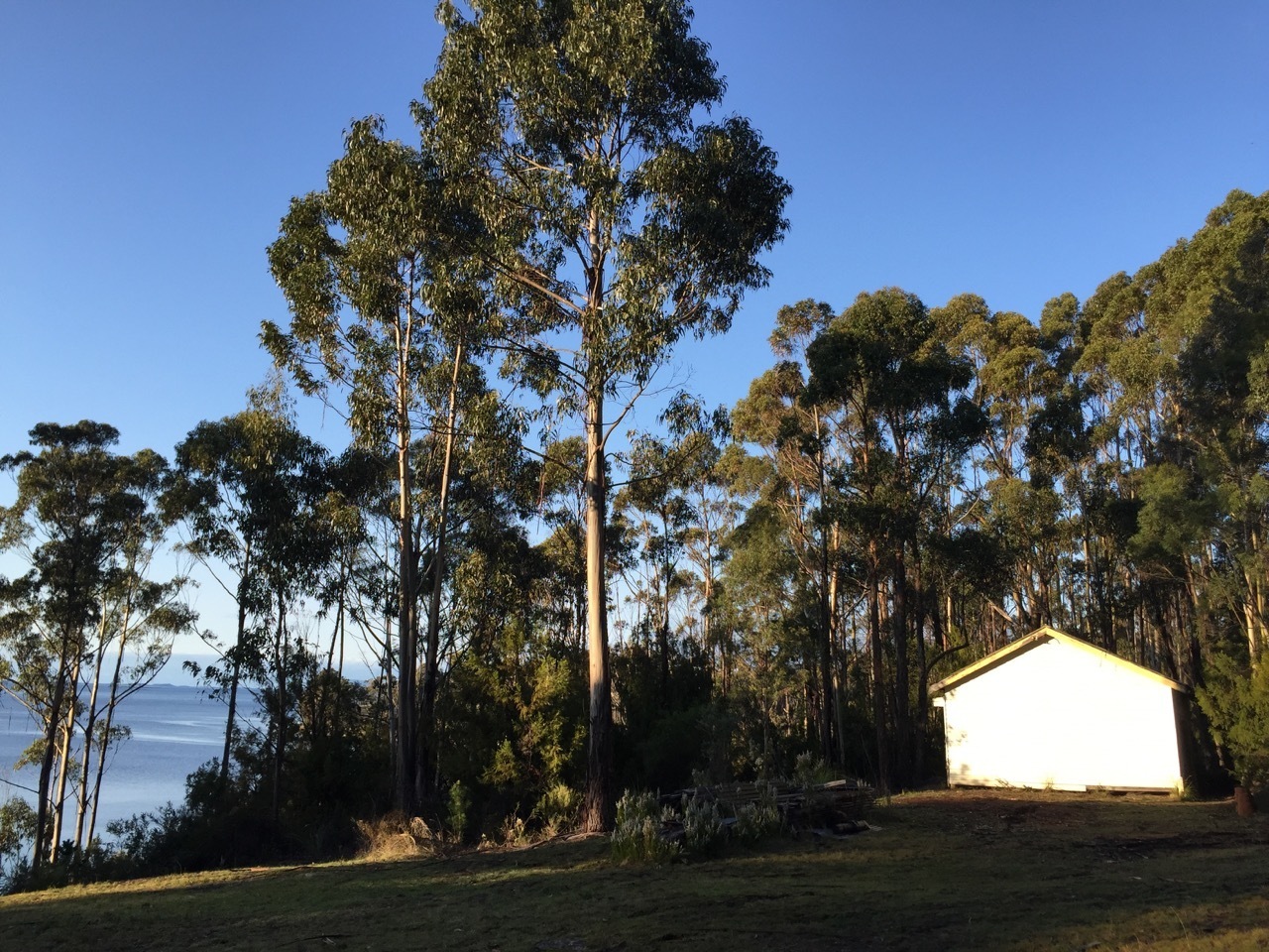 The large 1.5 acre clearing to the north of the block is sloping gently north-east and would allow for a number of ideal house site; balancing northern sun with stunning water views to the East. The view spans from North Bruny Island, the Isthmus and distant Fluted Cape on South Bruny Island. A old weatherboard house sits level on stumps which could easily be transformed into a shed or temporary dwelling and is lockable and watertight as is.