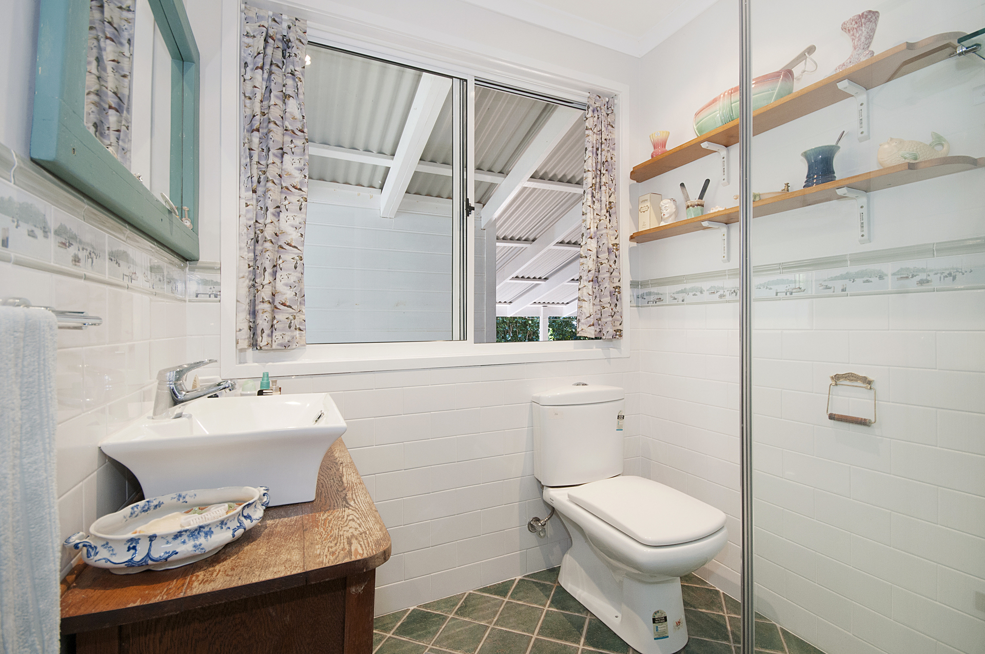 * The bathroom has feature wall & shower tiles, English oak vanity.