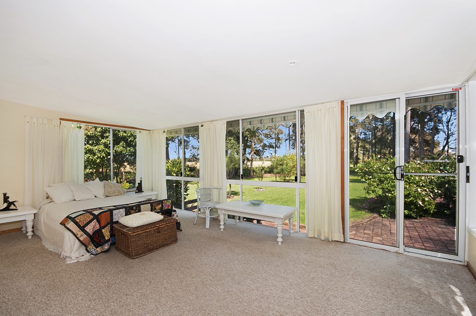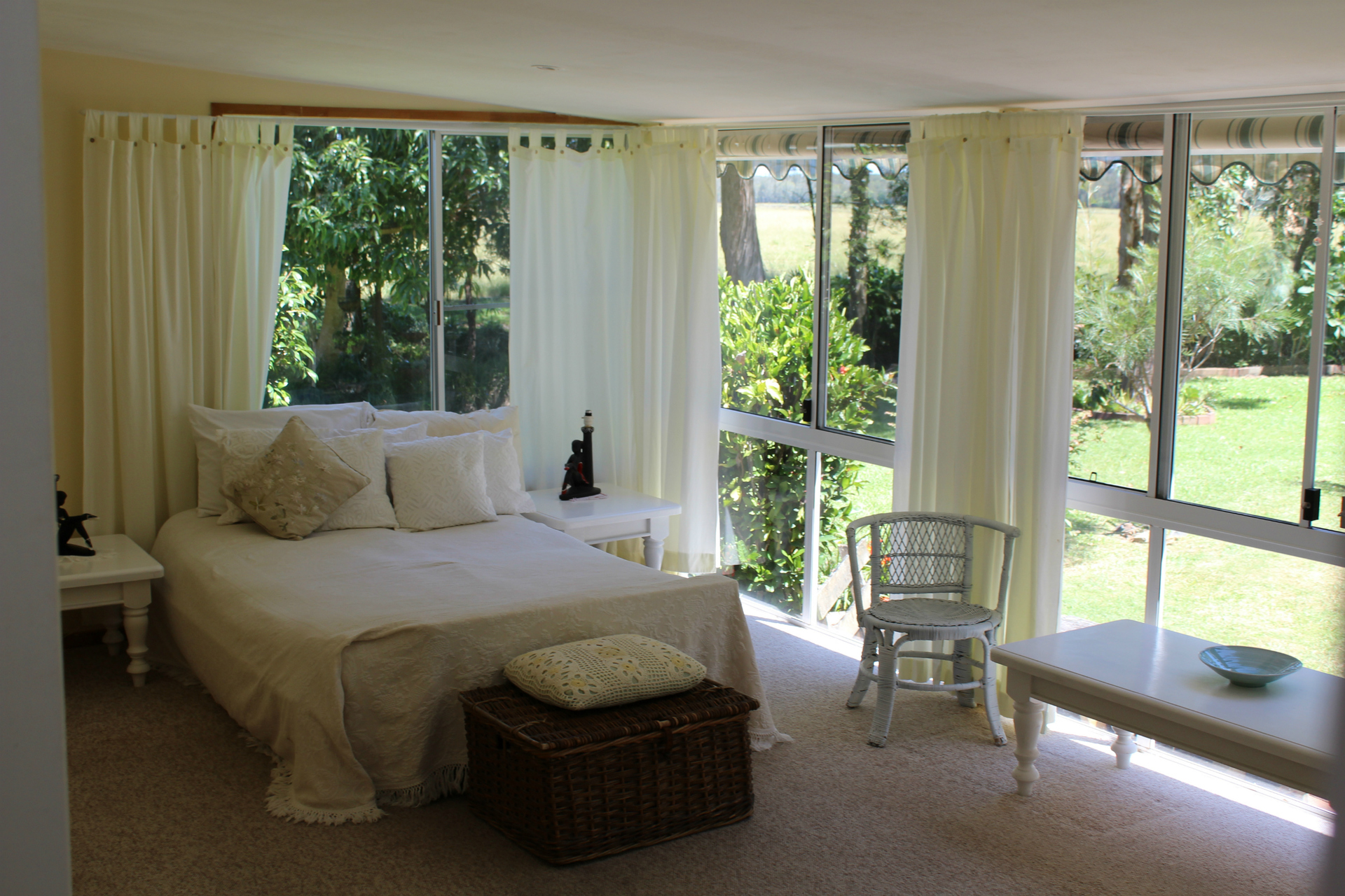 * Master bedroom with triple aspect windows overlooking garden and paddocks beyond. Gas heater jack. TV outlet. External window shades.