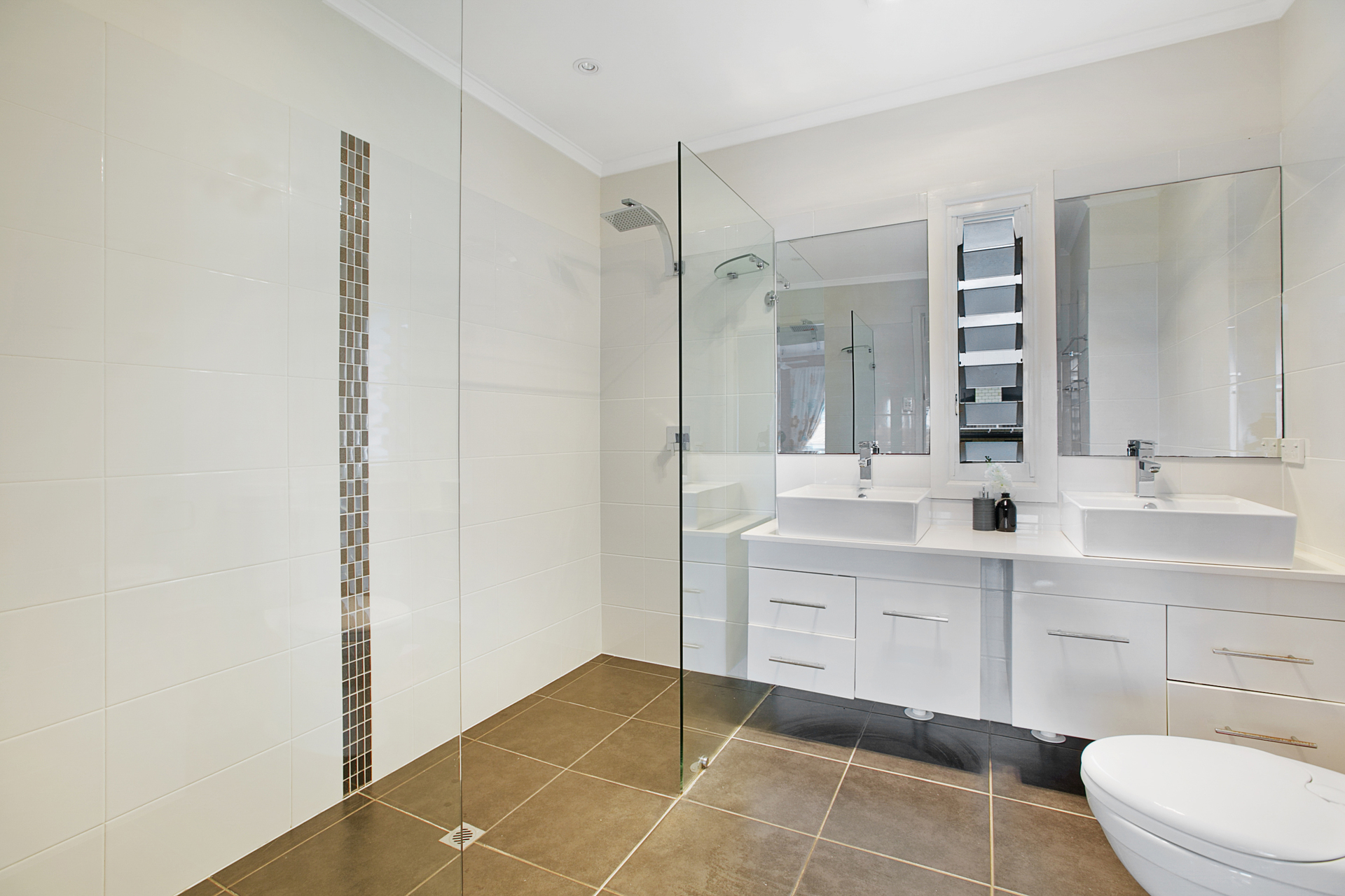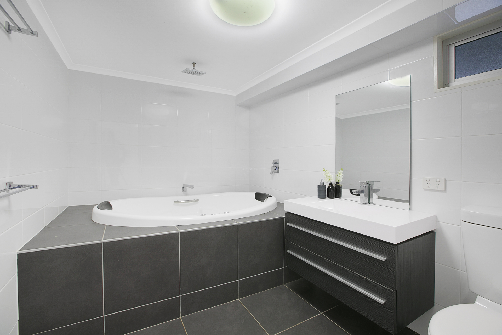~ 2 Bathrooms. The upstairs bathroom has a modern finish with a double shower and vanity, while the downstairs bathroom has a couples spa bath