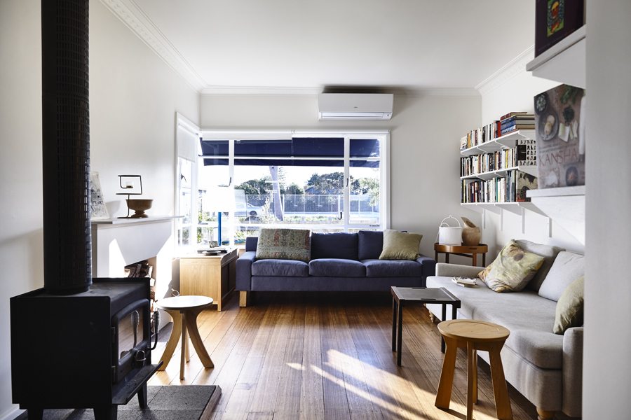 Large open plan living with wood fire stove and split system