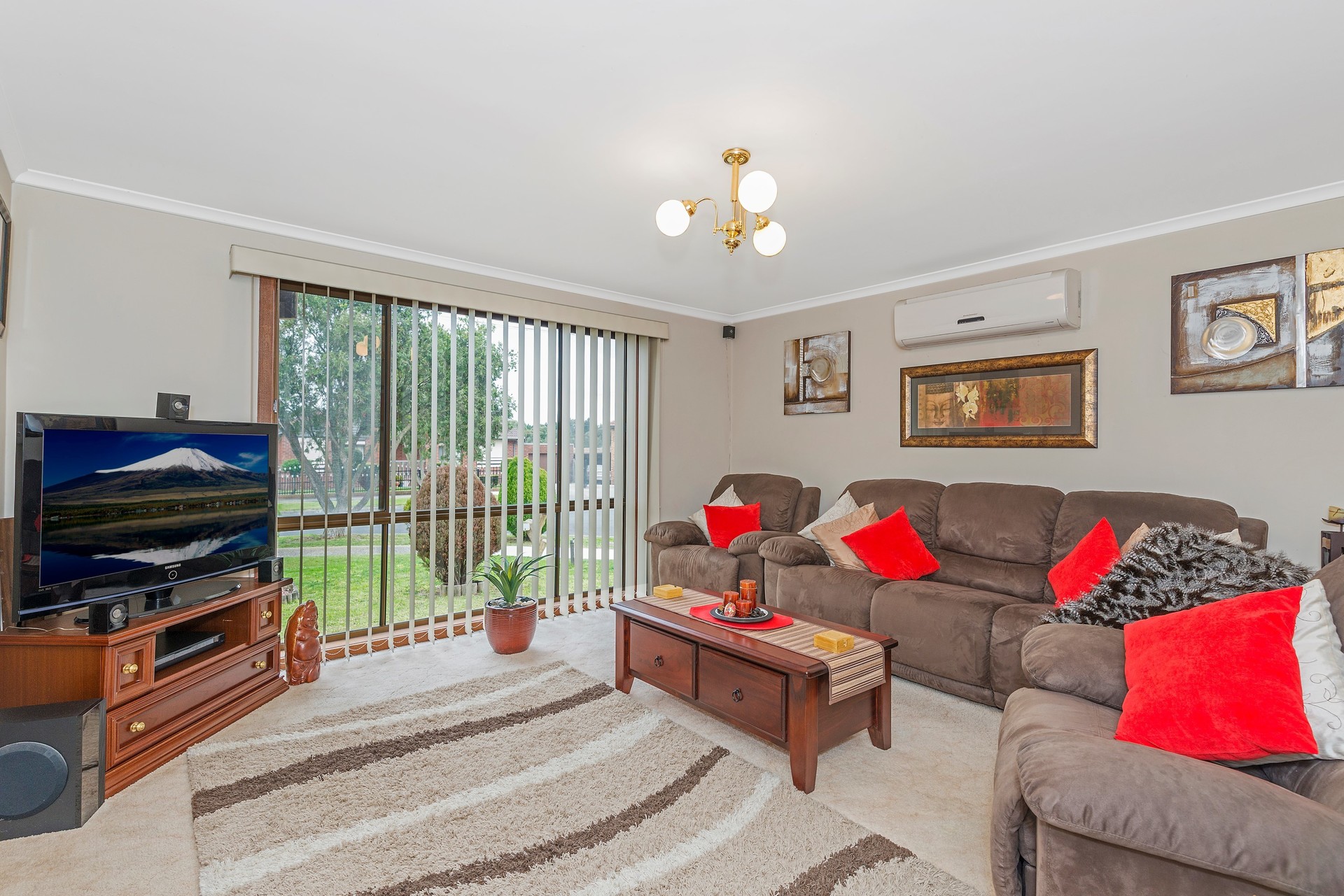 Reverse cycle air conditioning in lounge room as well as a vertical gas wall heater in dining. Electric wall oven and grill , gas cooktop.