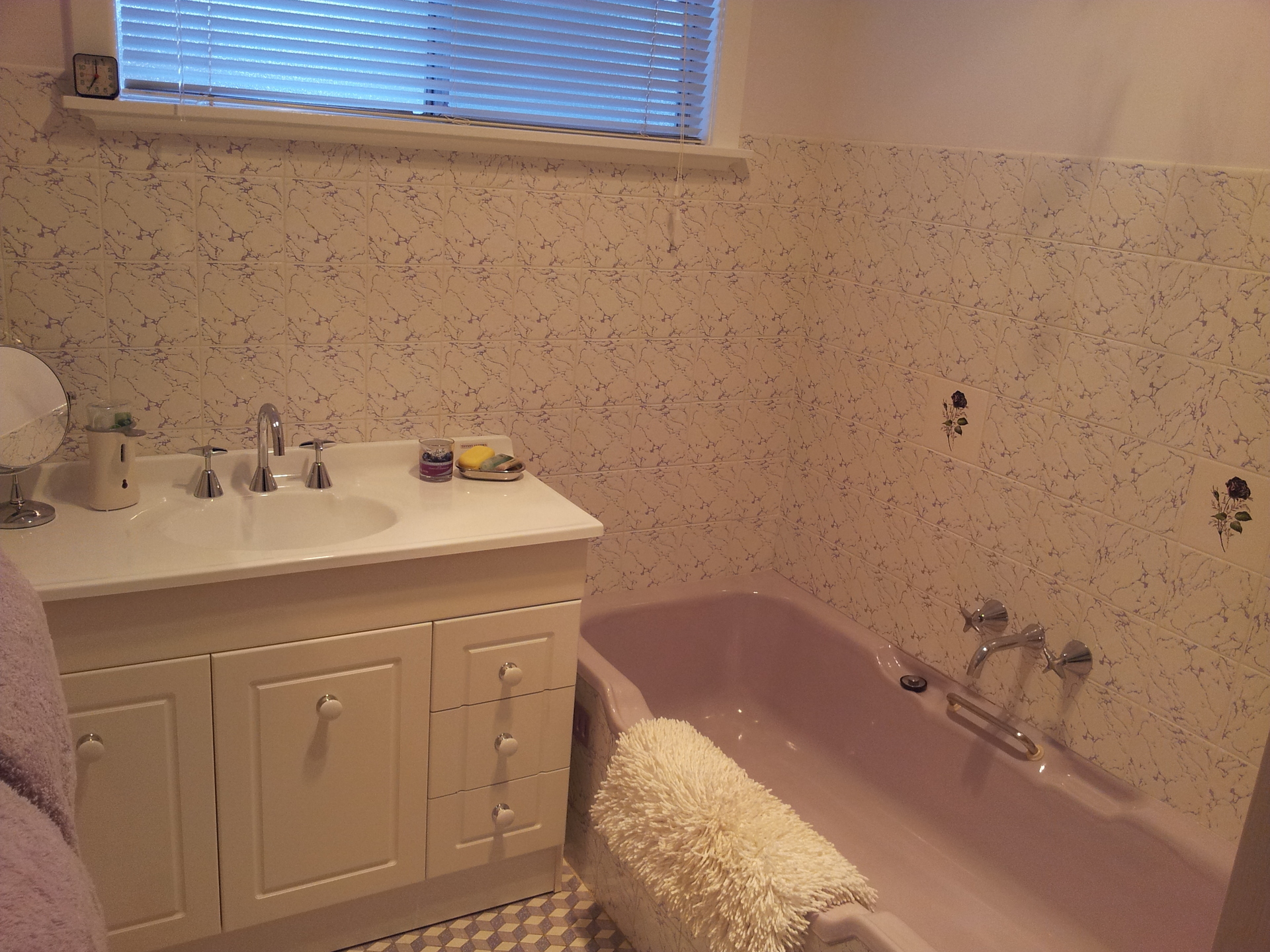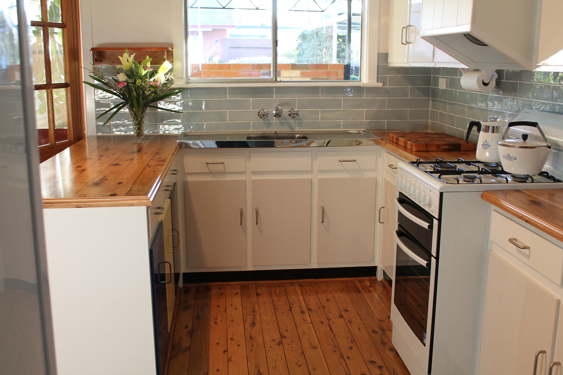 The spacious kitchen has been renovated and includes solid timber bench tops, new Spanish tiling and gas appliances.