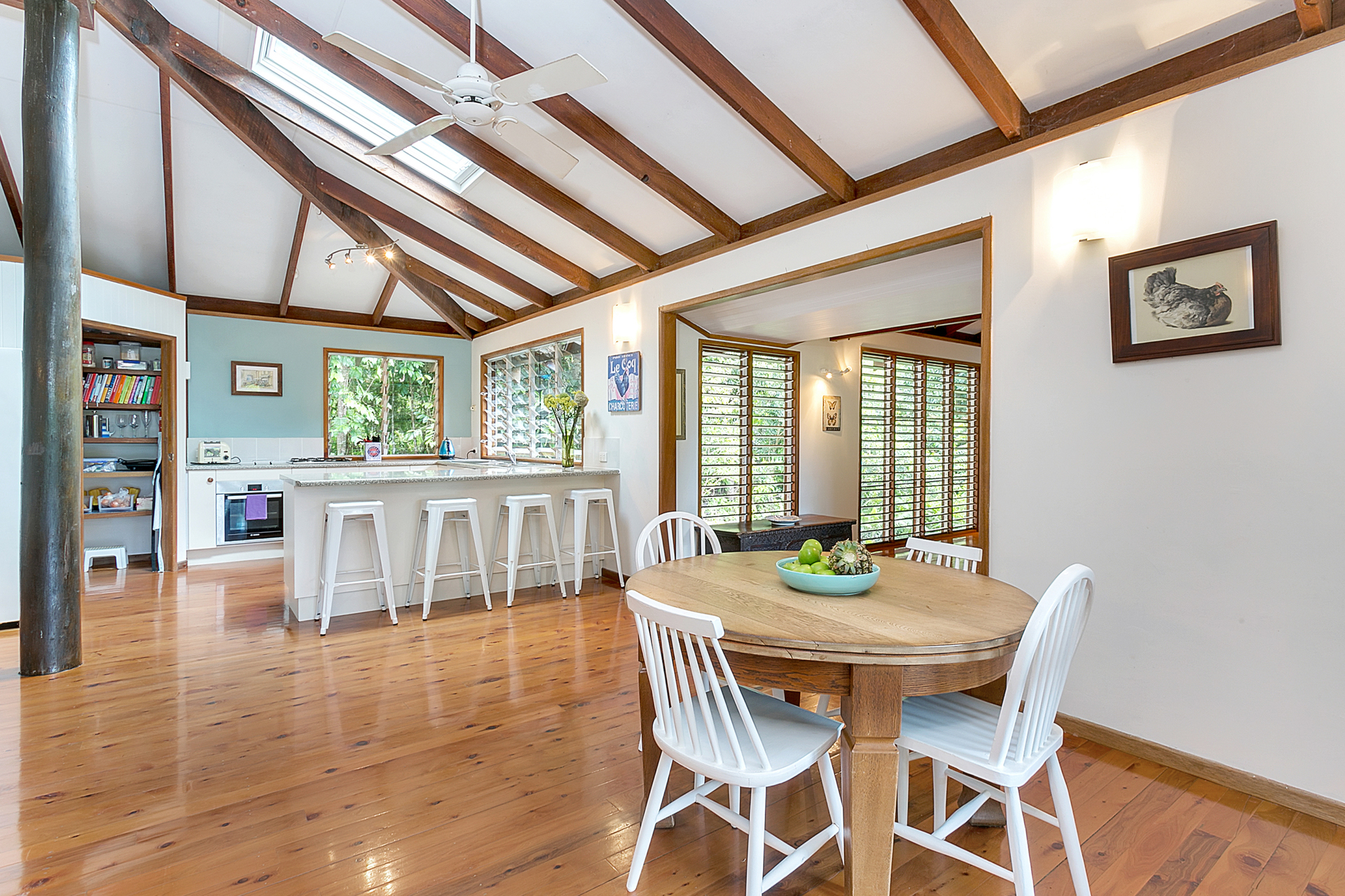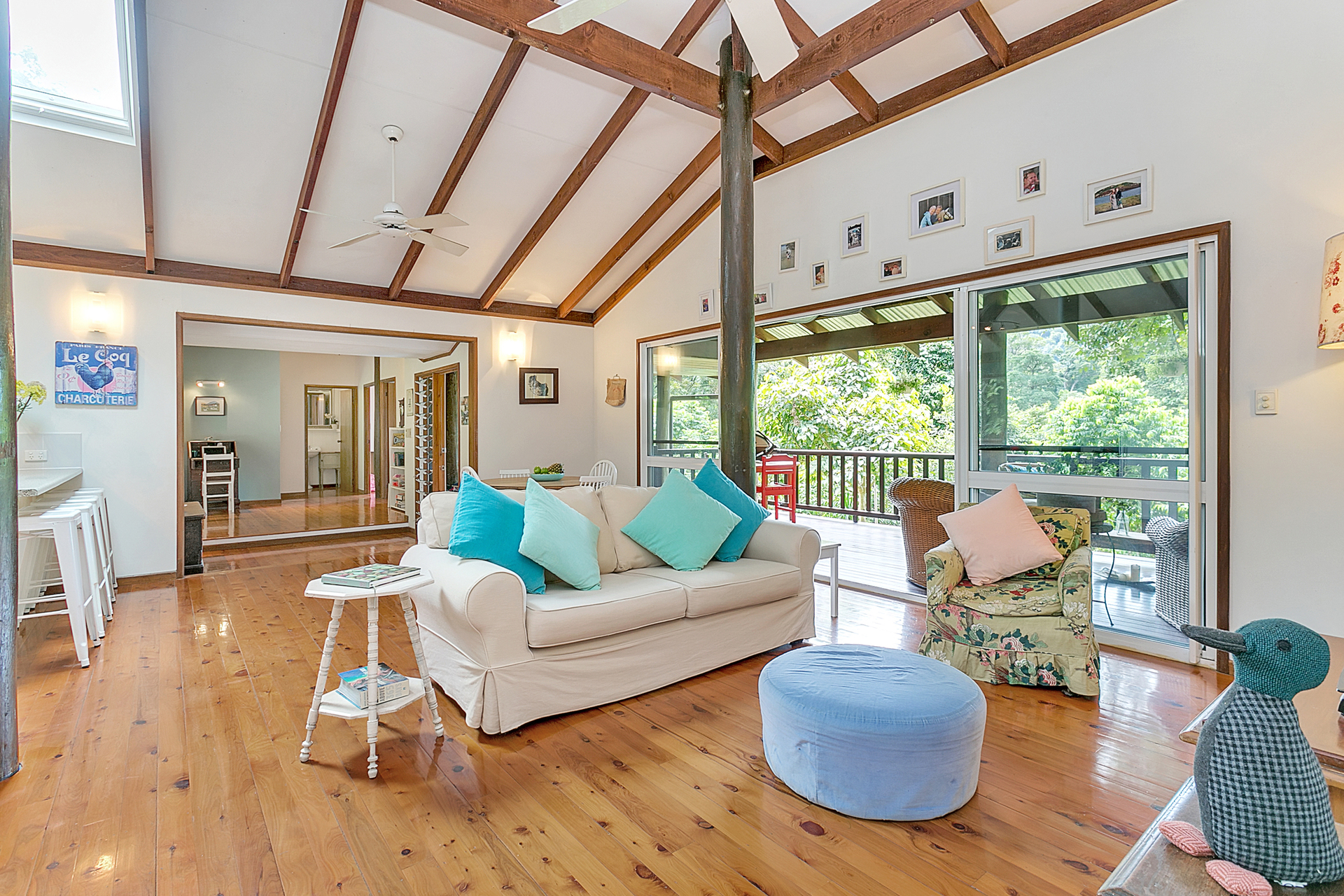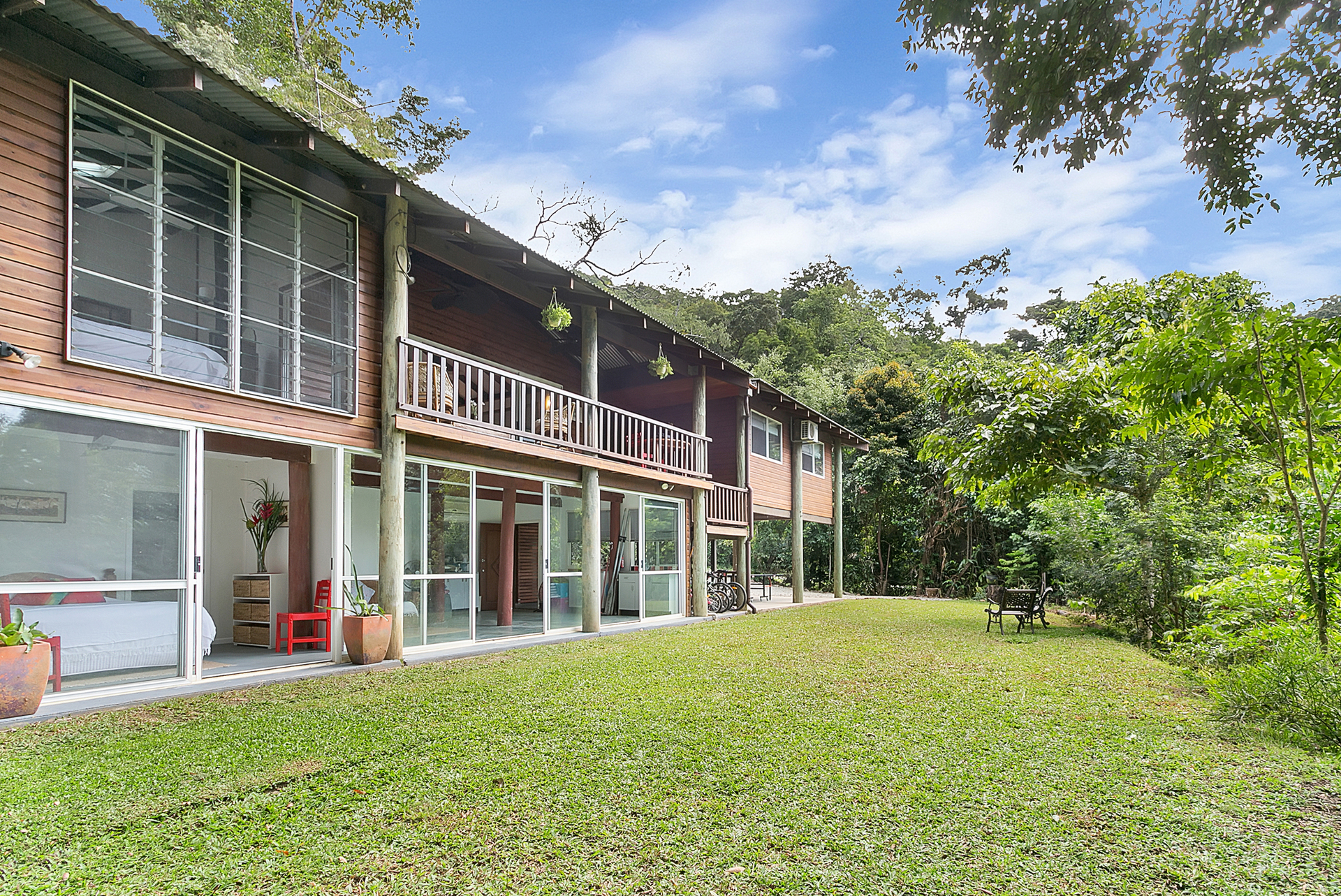 This stunning two-storey timber pole home, designed by renowned architect Chris van Dyke, is nestled in rainforest and set on a large private block.