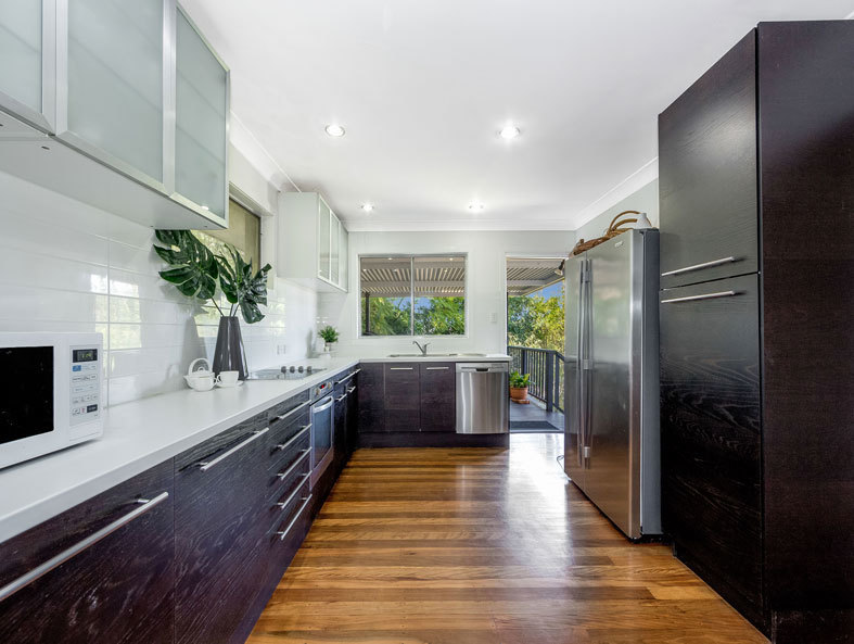 The modern Kitchen shows functionality, with expansive bench tops, it adjoins the Dining and Outdoor decked entertainment areas. Both Front and Rear Decks offer great privacy. Outdoor entertaining extends to the lower level with a courtyard area meeting the grassed back yard, perfect for watching kids play.