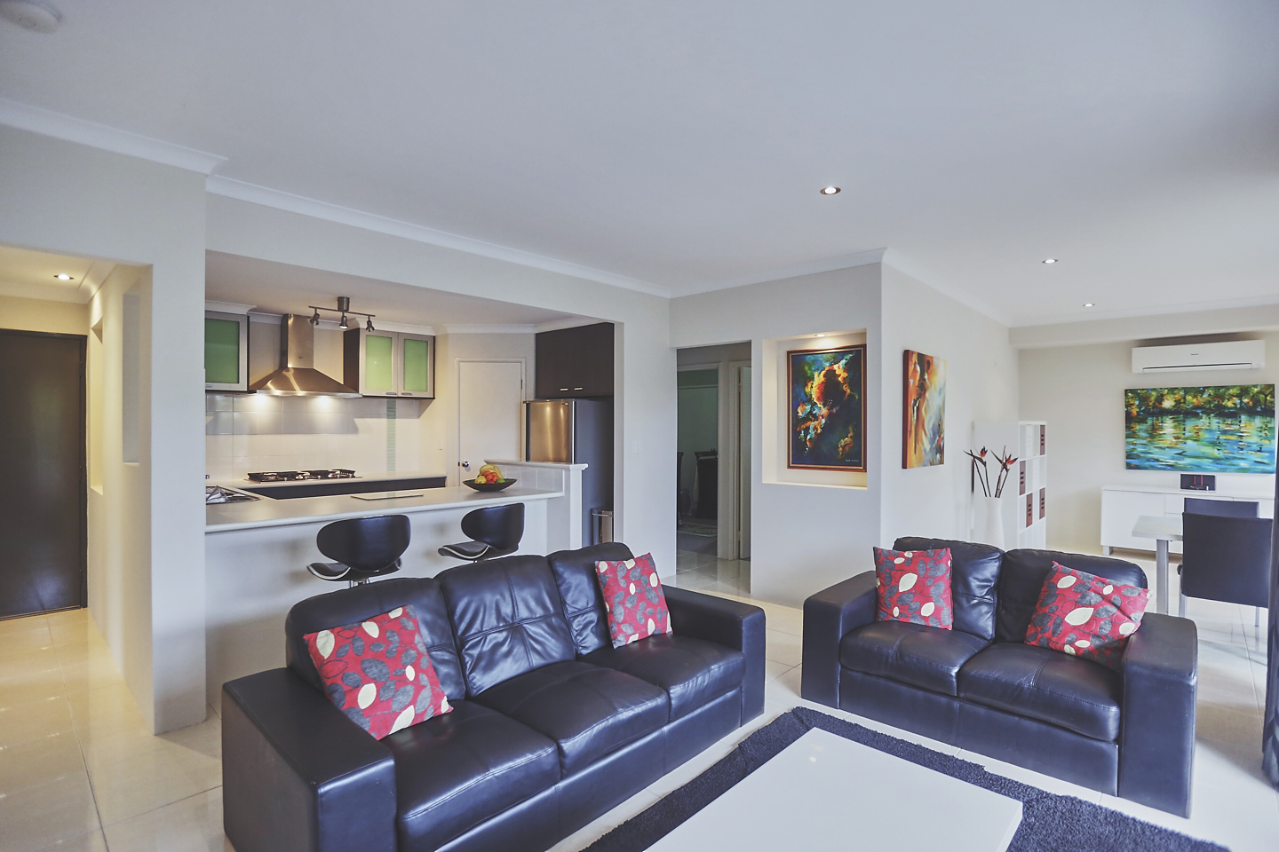 North facing main living area opens directly to a good sized private courtyard/garden/grassed area with large custom made shade sail for summer.