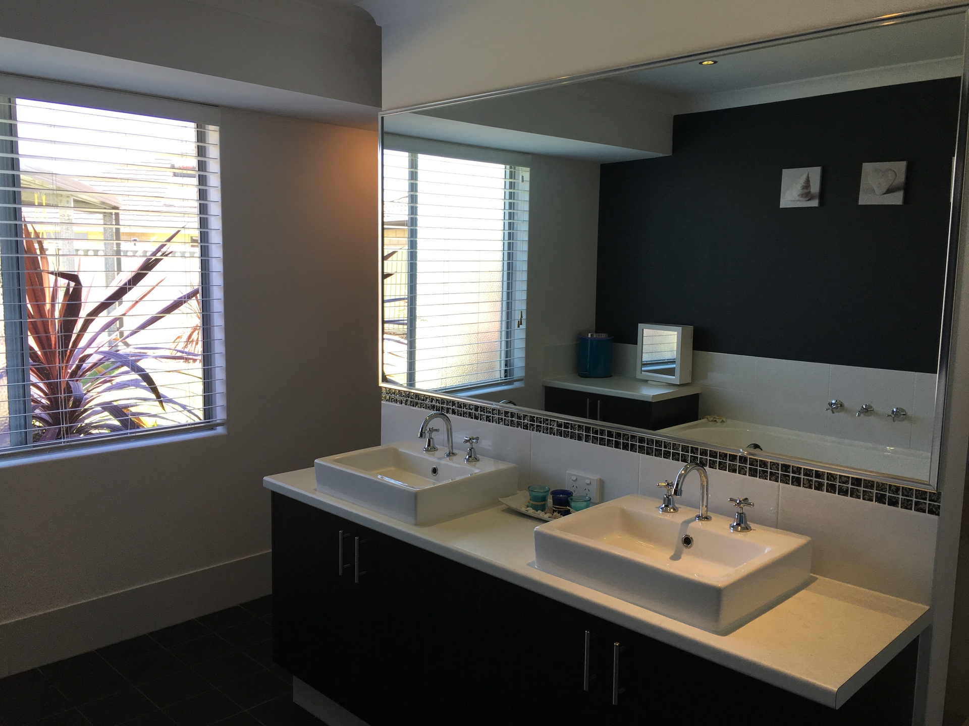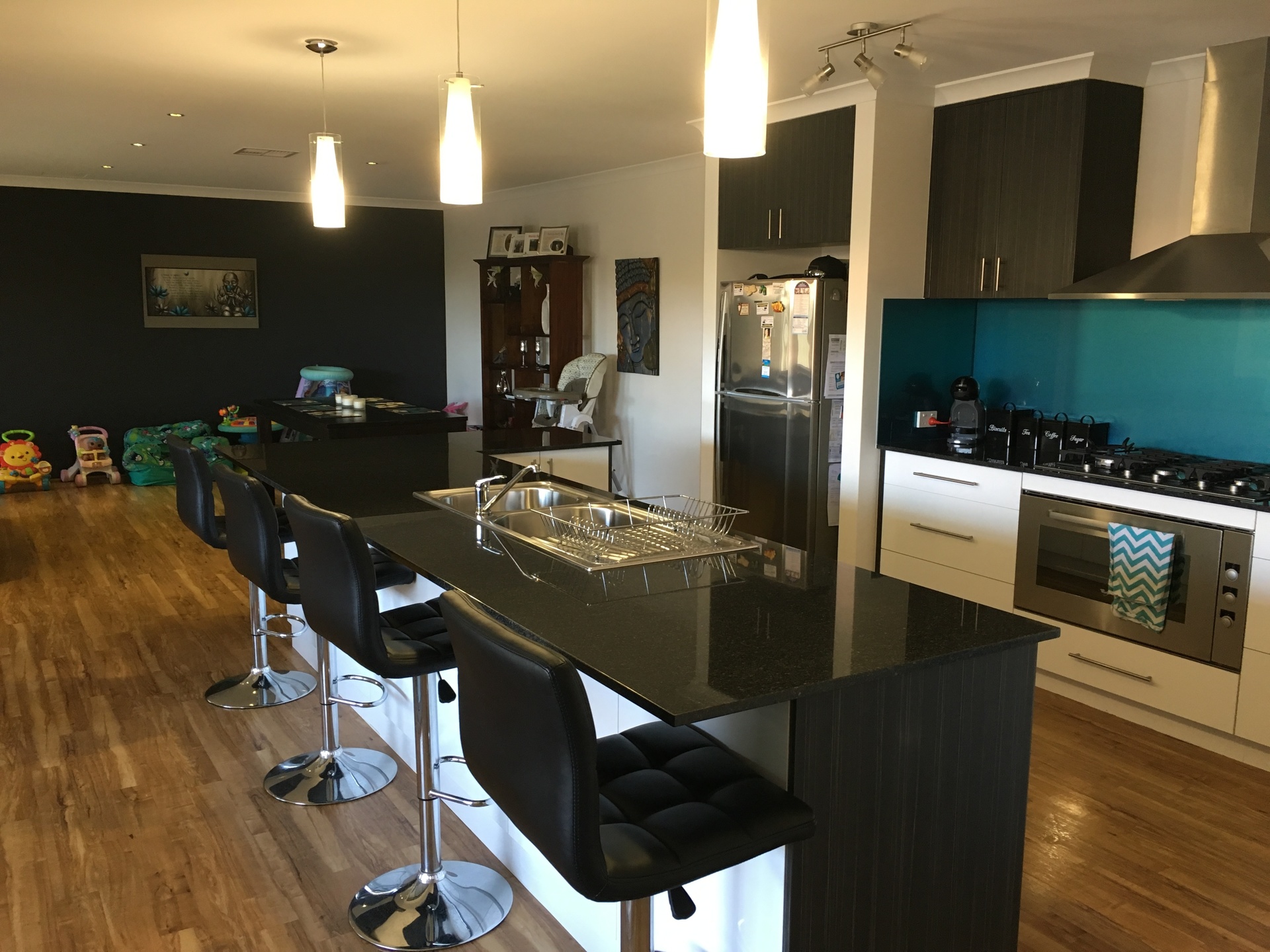 Its modern, with Flint granite 20mm bench tops, Overhead cupboards and gorgeous Aqua blue glass splashback as well as a huge master suite with Walk in wardrobe and Double shower with ecco rain square shower heads.