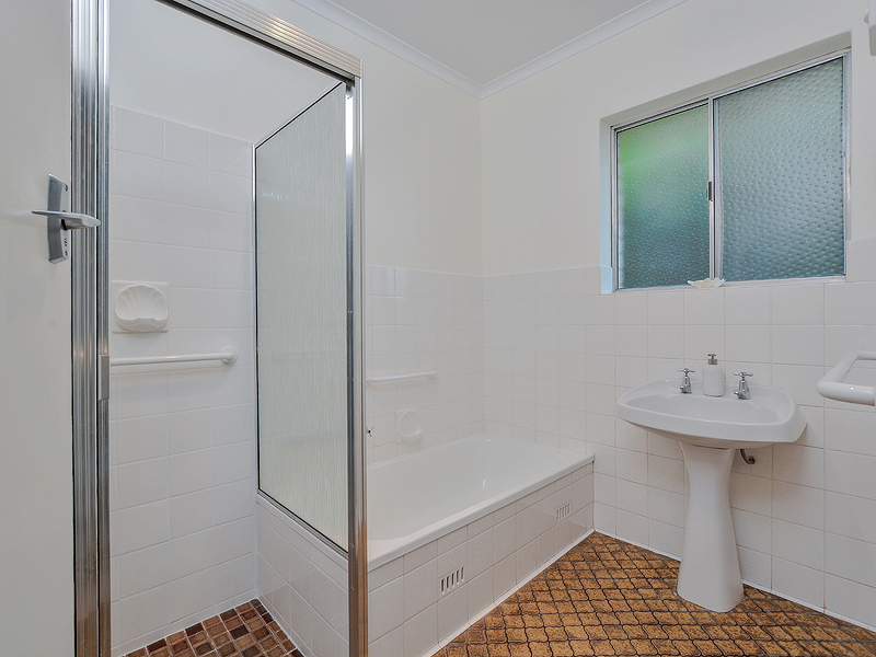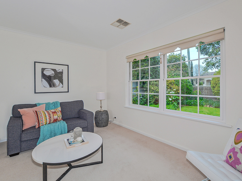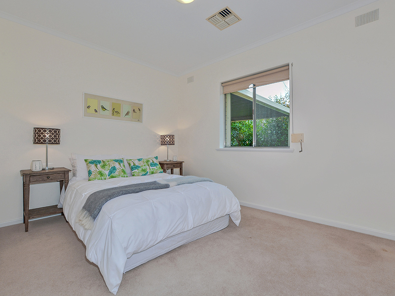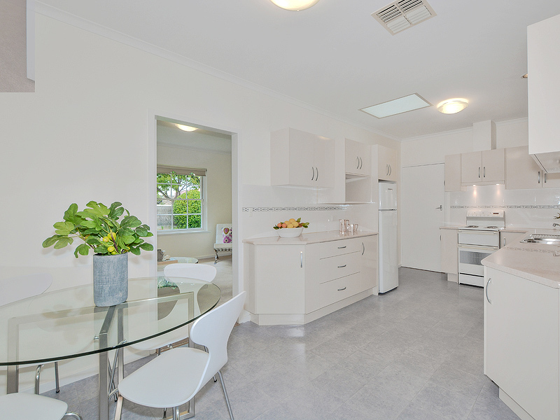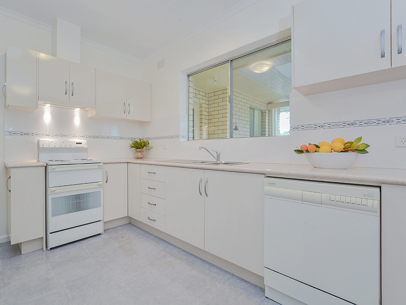 Freshly painted in neutral tones, modern kitchen, casual meals area, lounge, spacious main bedroom with built-in robes and ceiling fan.