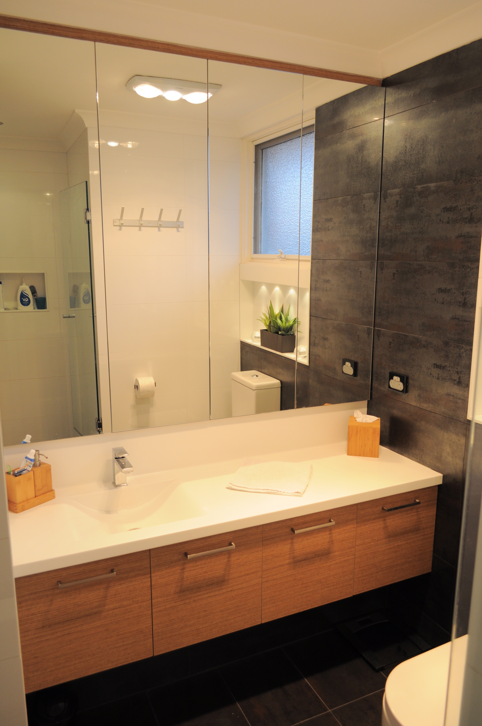 + Main bedroom has a large built in robe, separate storage in the under bench cabinets along the length of the bedroom wall. Pendant lights hang from the ceiling to your bedside tables and this room includes reverse cycle A/C