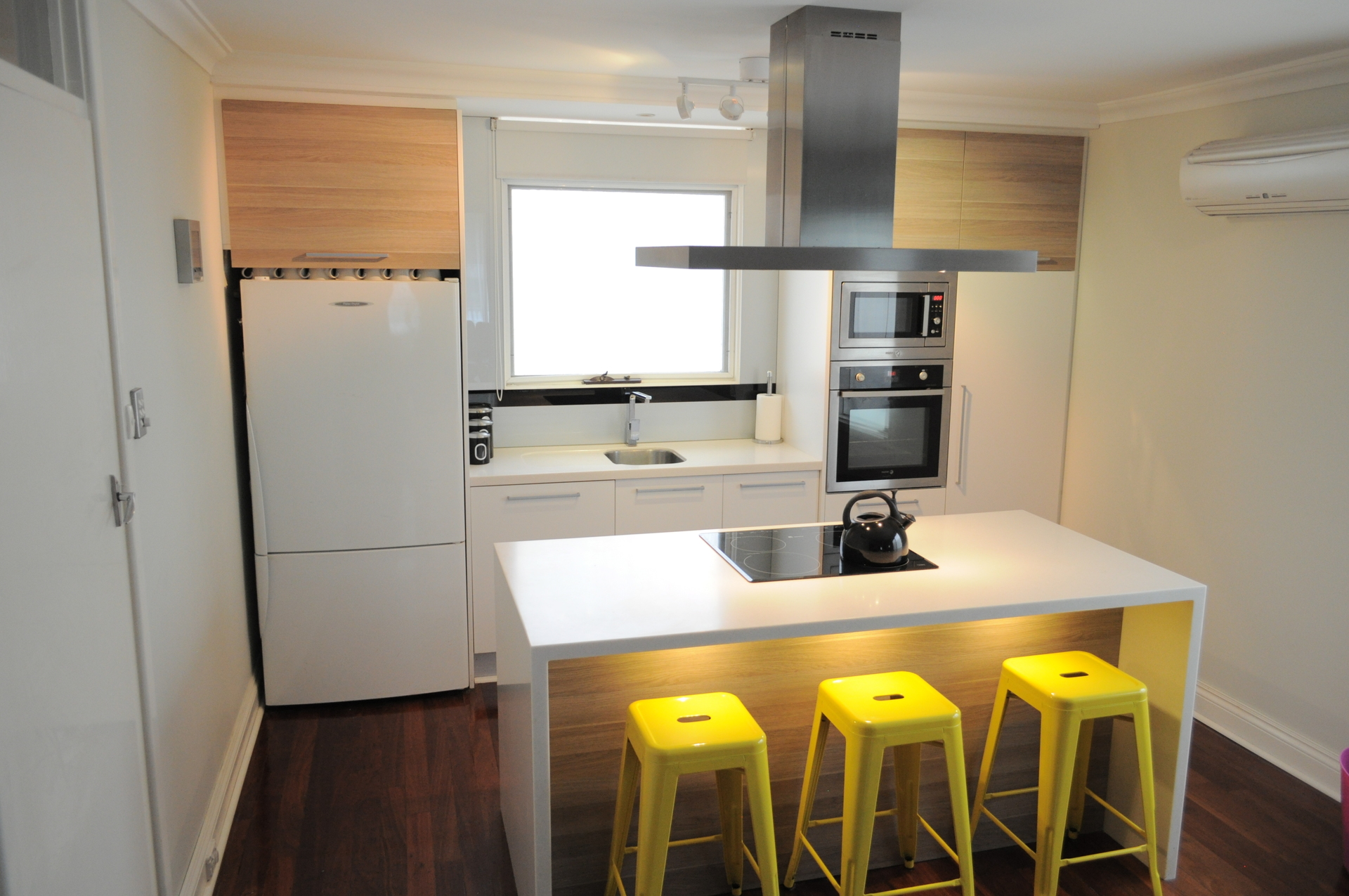 + Well designed functional kitchen with integrated dishwasher and lots of storage. Stand alone island work bench with an induction electric cooktop and island rangehood. The kitchen incorporates a stainless steel pyroletic self cleaning oven with a separate convection multipurpose microwave in the superb cabinetry.